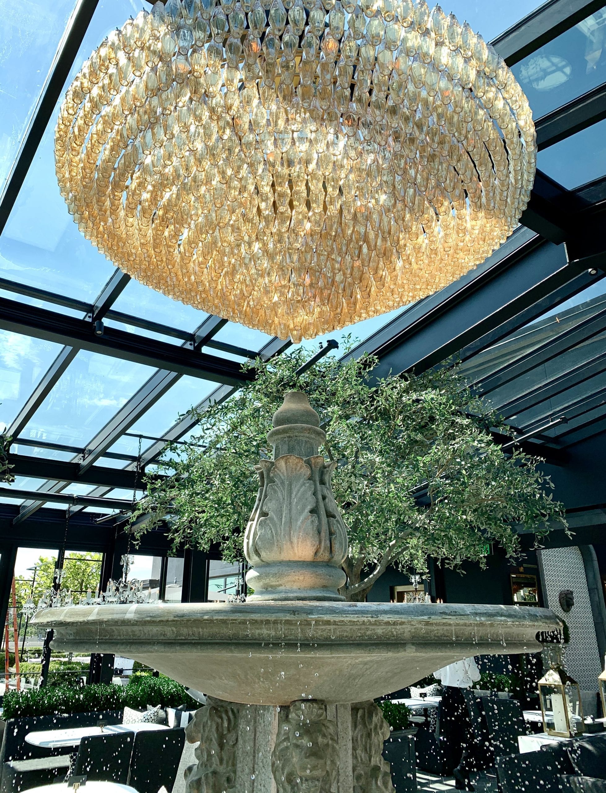 Aside from the sheer vastness and grandeur of the space, what distinguishes RH Charlotte is the glass-enclosed rooftop restaurant, a bright, greenery-filled atrium dripping with sparkly chandeliers and flanked by open-air lounges for guests needing a shopping break or waiting for a table. The restaurant serves breakfast, lunch and dinner during regular store hours — currently there are no extended hours for late-night stargazing.