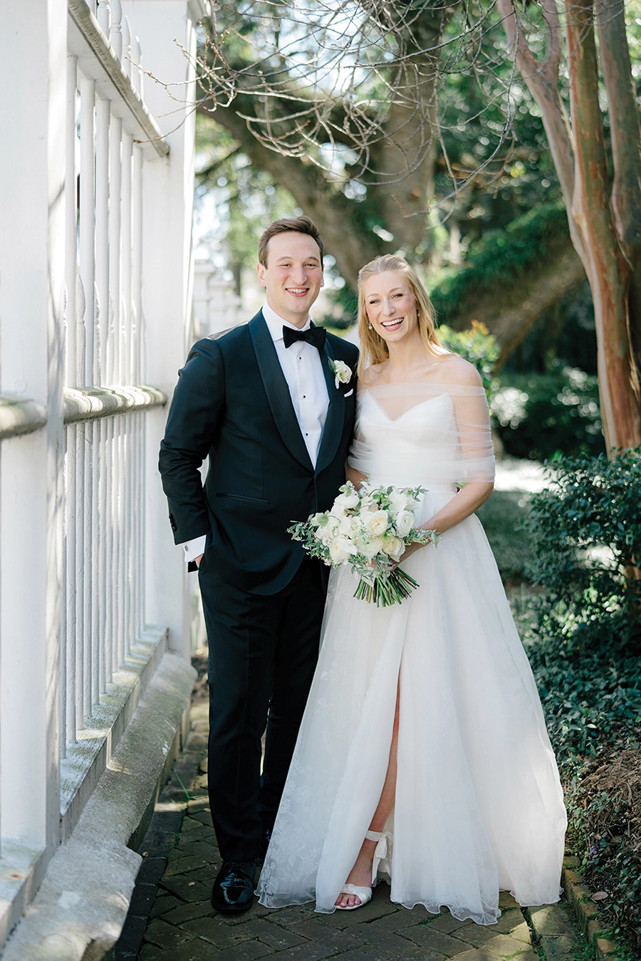 After a first date in South End in early 2022, Dom proposed on Christmas Eve the following year. For their wedding, they wanted a classic, chic celebration with modern elegance and lush florals and greenery. A native Charlottean, Allison was torn between getting married in her hometown or Charleston. But a tour of The Governor Thomas Bennett House, with its grand piazza, gorgeous garden and majestic trees, made her decision. “It was the perfect mix of historic and intimate and so beautiful.”