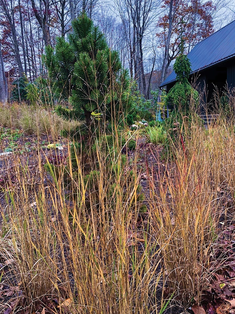 Finally, consider taller ornamental grasses such as panicums (switch grass), pennisetum (fountain grass) or calamagrostis (feather reed grass). Even though they turn golden brown to tan after feeling the autumnal frosts, they provide texture, structure and kinetic movement as they dance in the wind. They also provide shelter and food for birds and beneficial insects throughout the winter months.
