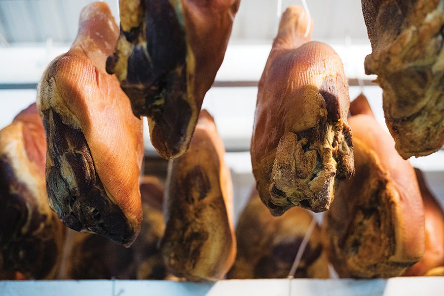 Clockwise from top left: Leverne Darby has worked at Cooper’s Country Store in Salters for 47 years; his father worked there for 30 years before him. Hams are cured for 90 days. Owner Russell Cooper’s wife, Novia, minds the store. The author chats with customers at Cooper’s.