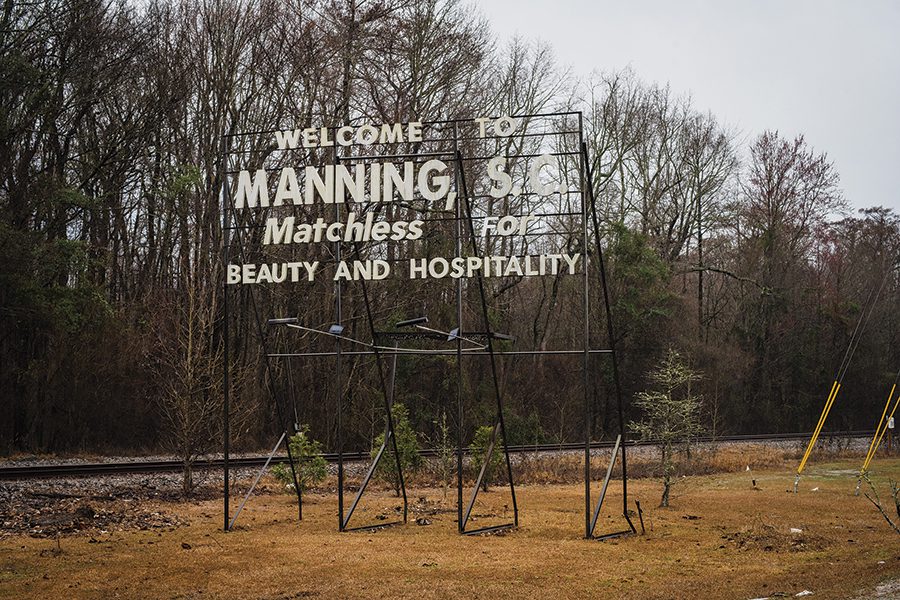 Perched up high, Manning’s welcome sign, top left, is unforgettable. In Alcolu, a perfectly patinaed old Chevrolet truck, bottom left, catches our eye. Morning view on the Black River, right.