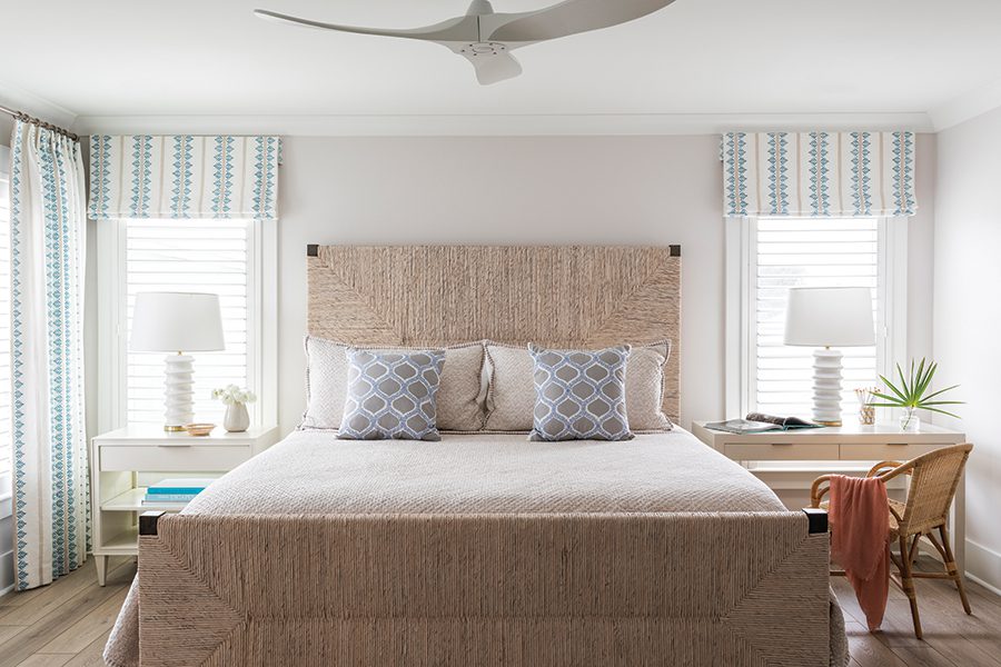 Left: A woven bed by Bernhardt adds texture and anchors the primary suite, while a striped drapery fabric by Thibaut adds color. Zeller chose a coordinating desk instead of a second nightstand so the husband could have a quiet remote working spot when the household gets busy with visiting family.