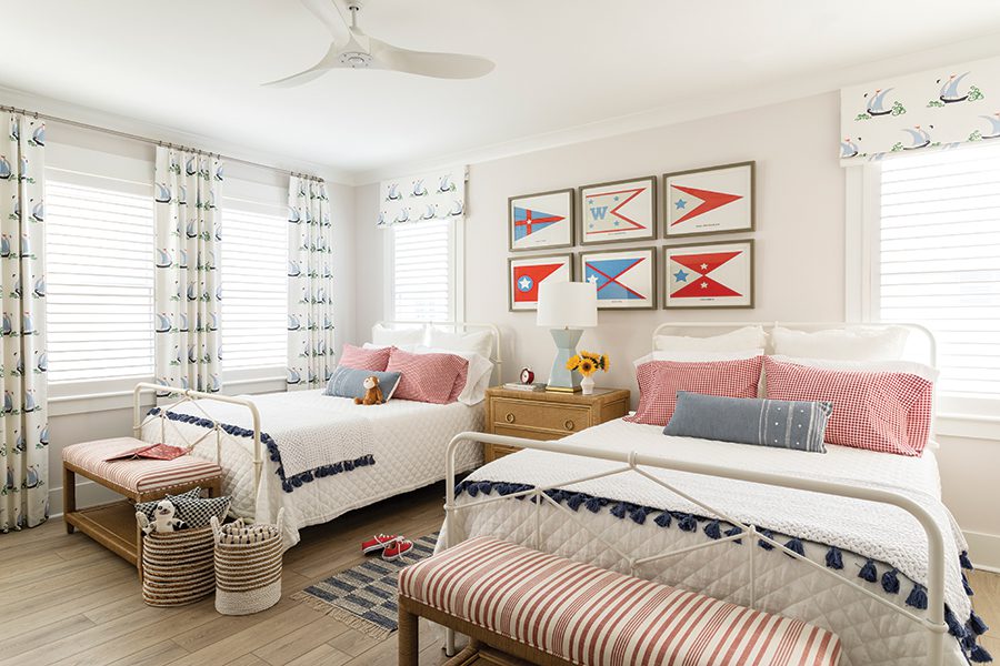 In the second-floor bedroom, Zeller chose a Katie Ridder drapery fabric with sailboats and bright red accents. “It’s so happy and manages to maintain a sense of sophistication while being fun and youthful.”