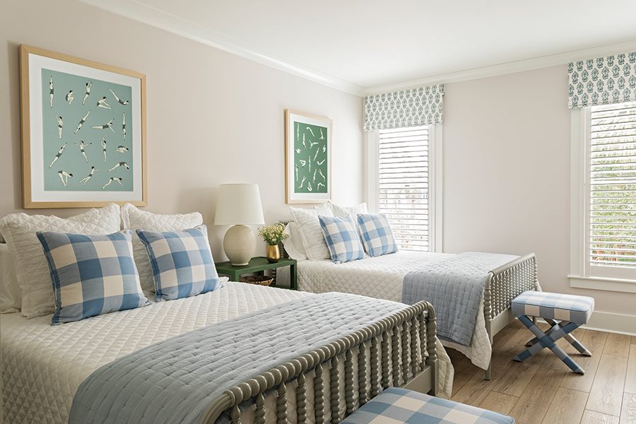 The modern coastal vibe continues with a whimsical print of divers from Wendover Art above each bed and blue gingham X-benches from Serena & Lily.