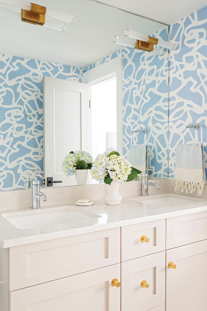 In the powder room, Zeller chose a Savannah Hayes wallpaper with a modern, bright blue design. “It’s just a really fun way to add a lot of color and fun and personality in a space that doesn’t really have any.” New cabinetry, countertops and Visual Comfort sconces also update the room.