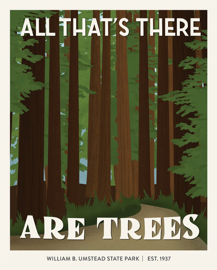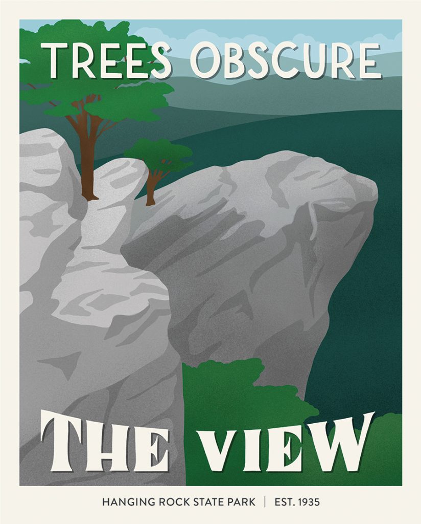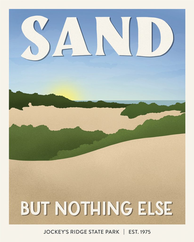 As a nod to her resident state’s diverse and awe-inspiring state parks resting on mountains, sand dunes and dense forests, Share illustrated a North Carolina series of Subpar Parks, shown above, exclusively for SouthPark and its sister publications. Share’s illustrations are a reminder of how lucky we are to be surrounded by incredible state parks and recreation areas in North Carolina. Use them as inspiration to get outside this summer and reconnect with nature. SP