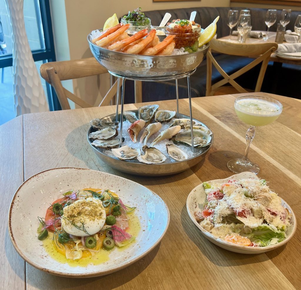 Seafood Tower, Burrata, Baby Gem Caesar Salad; Tiki-inspired cocktail