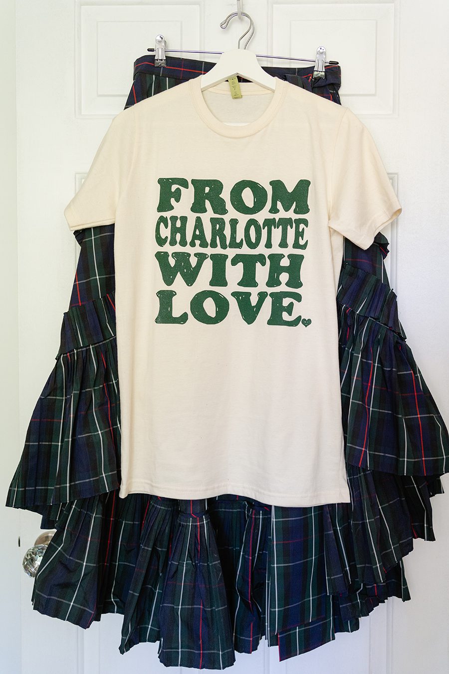 There’s a top — it’s actually a sample, and there are only three of this shirt. [Former J.Crew president] Jenna Lyons owns one. [The Duchess of Cambridge] Kate Middleton owns the other. My second hero piece is everybody’s favorite: a skirt that also came from [a J.Crew] sample sale. I have two of them — one is tulle and khaki, and I also have one that’s taffeta. My favorite tee right now is From Charlotte With Love, because I am from here. J.Crew used to make bridal, and I have a bridal tux that at some point I am going to wear.