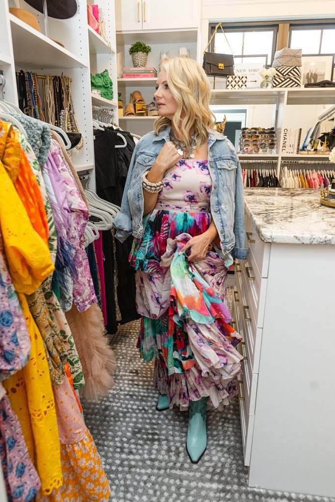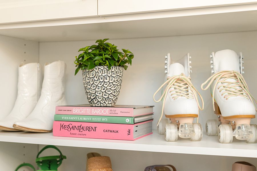 I like to organize by color: the floral dresses, then black and white dresses, then the darker stuff if I am feeling a little moodier. In the winter, the darker florals come to the front, and the lighter florals go to the back. My sister helped with the shelves. She has an eye for design that I feel like I don’t have. I can do it in my house and my bar area, but in my closet, it has to be very functional. I don’t want to be looking around for my things.  SP
