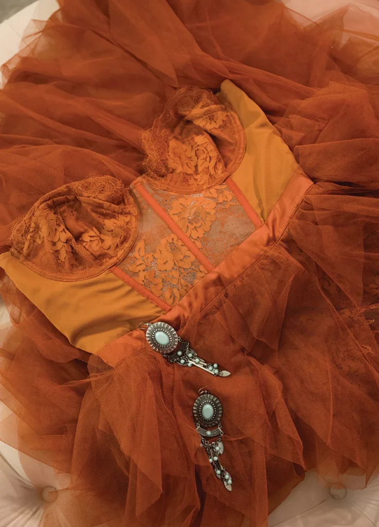 Favorite items: Besides my Frye boots, my embroidered and beaded vintage handbags. An orange lace and tulle dress I wore for my engagement photos. Also, a signed Van Morrison guitar that was a Christmas gift from my parents years ago. My mannequin, Stevie, that I got from Anthropologie when I worked there. She gives me inspiration. Sometimes I put outfits on her that are more aspirational than I would tend to put on myself, but then once I see it on Stevie, I will go for it.  SP