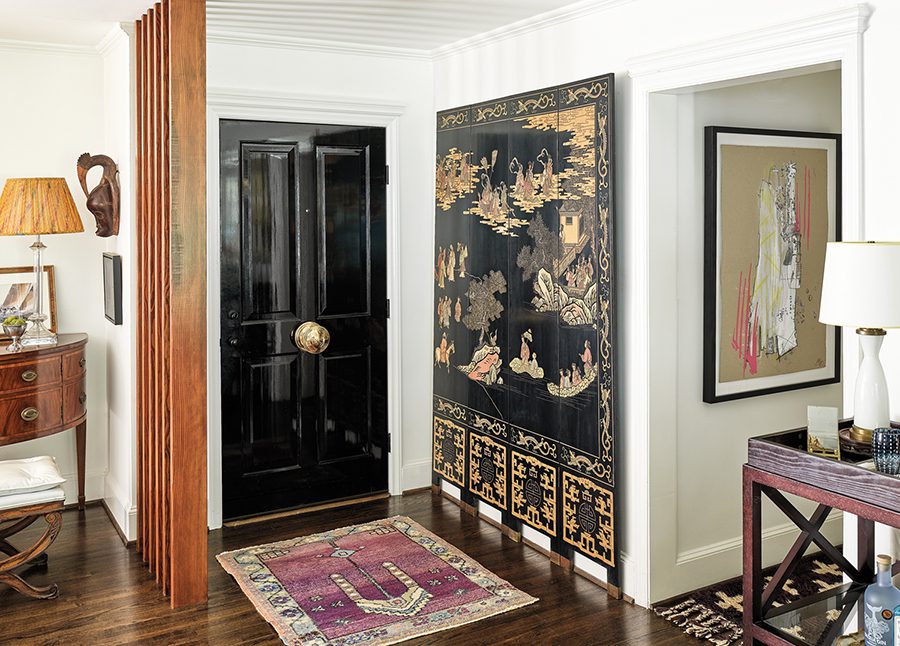 Left: An antique buffet from Walter Pringle’s grandmother showcases a silver tea service awarded to Christi’s great grandfather in a boat race in 1937. He was a sea captain and invented a class of boat called the Moth boat. Fabric lampshades were sourced from Cashion Hill Design. The large artwork was a wedding gift from Walter’s step-grandfather, a pioneer of computer art. Right: An antique Asian screen, an heirloom from Walter Pringle’s grandmother, makes a statement in the foyer. The Pringles added wooden slats beside the front door to create a division between the entry and living room. The rug is from Adrienne Davis Design.