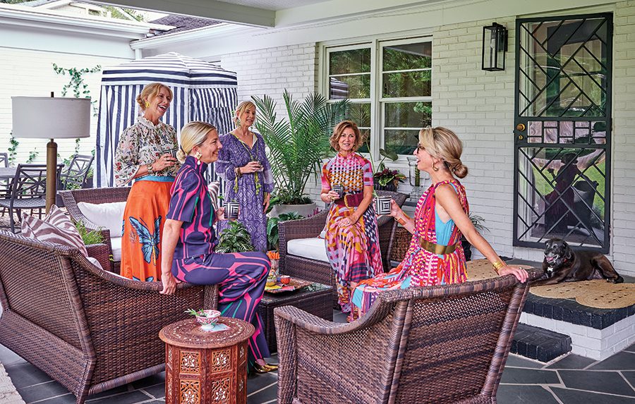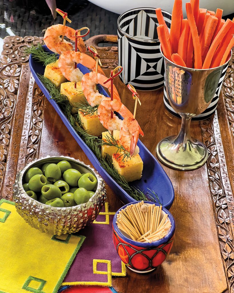 Left – Right: Wine awaits guests in a vintage silver nautilus wine chiller that Christi also uses as a planter. A porch party with dear friends who have supported FOUND since its beginning in 2016. Christi’s father brought the round table home from Morocco. Hors d’oeuvres are served on a handcarved wooden tray that Christi’s father bought in the Philippines. The engraved silver cup is a 1932 boat race trophy won by her grandfather.