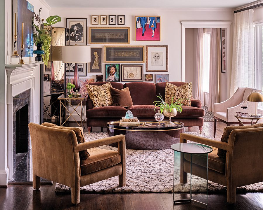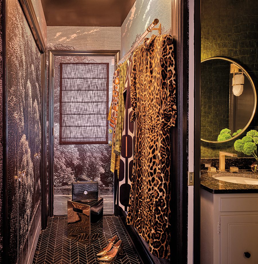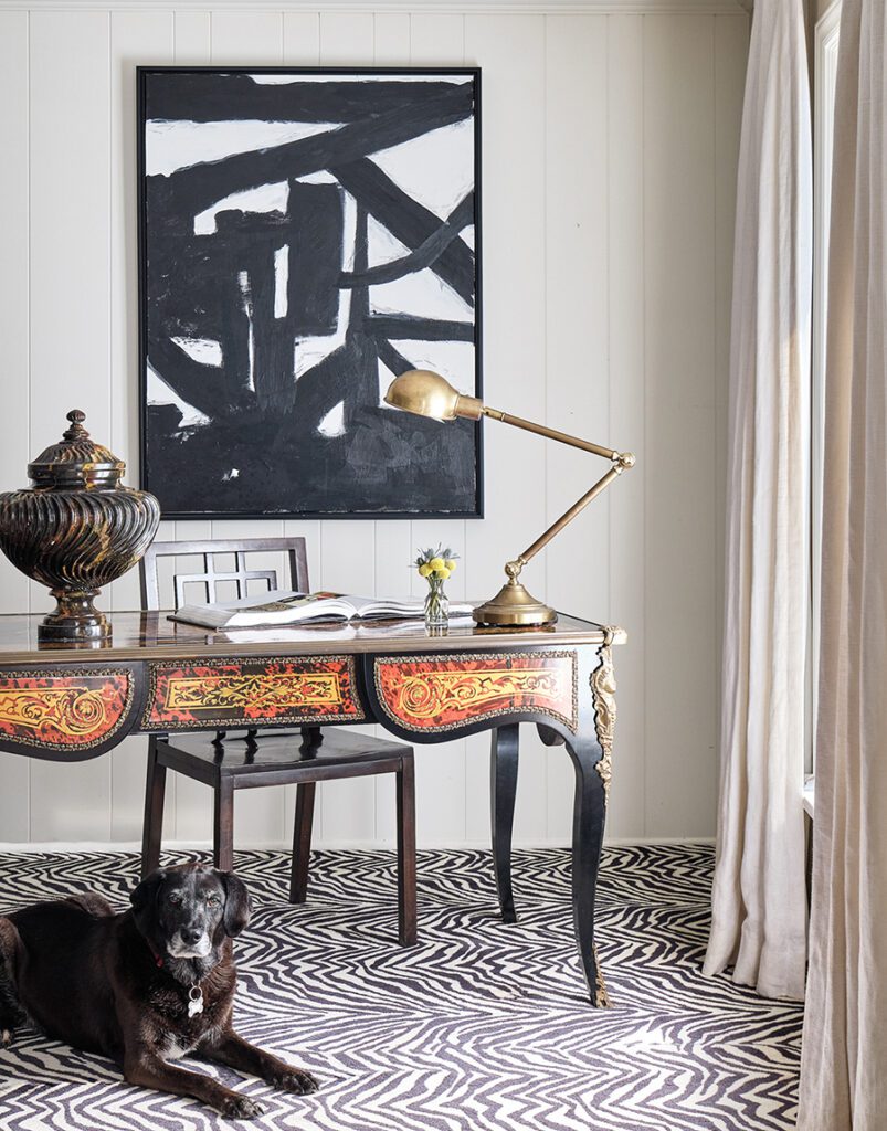 From left: The gallery wall in the living room features an eclectic mix of art, including brass rubbings from Westminster Abbey during a family trip to London in the 1980s, a pencil drawing of Pringle’s grandfather that she sketched in high school and silhouettes of various family members. Christi Pringle in her accessories closet, wearing one of FOUND’s signature items, a skirt embroidered by Indian women who are HIV positive. Her earrings are made from antique Venetian glass by a London designer. Right: Cocoa the dog commandeers a corner in the family room, anchored by a hand-painted French desk from the Charleston home of Walter Pringle’s grandmother. A black-and white-abstract painting by Christi Pringle accents the space.