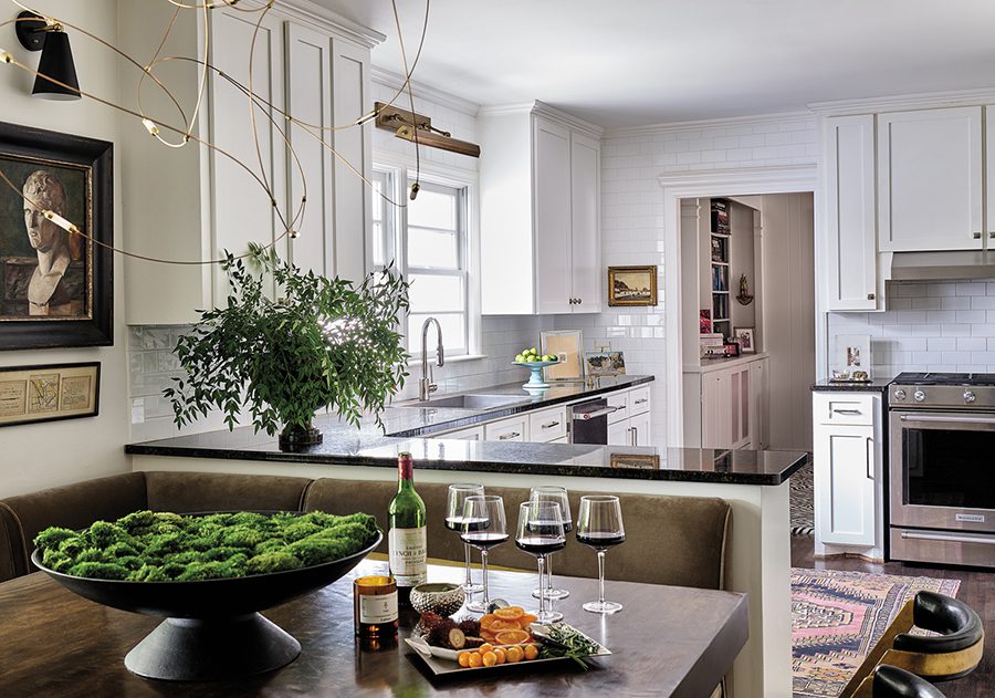 From left: A portrait of Walter Pringle’s grandmother greets guests at the bar, which is accented with heirlooms and travel souvenirs. A Moooi chandelier illuminates the custom Jonathan Kauffman dining table. Kauffman assembled it on-site, and Christi wrote a prayer on the center post before he affixed the top. The banquette is from Ballard Designs.