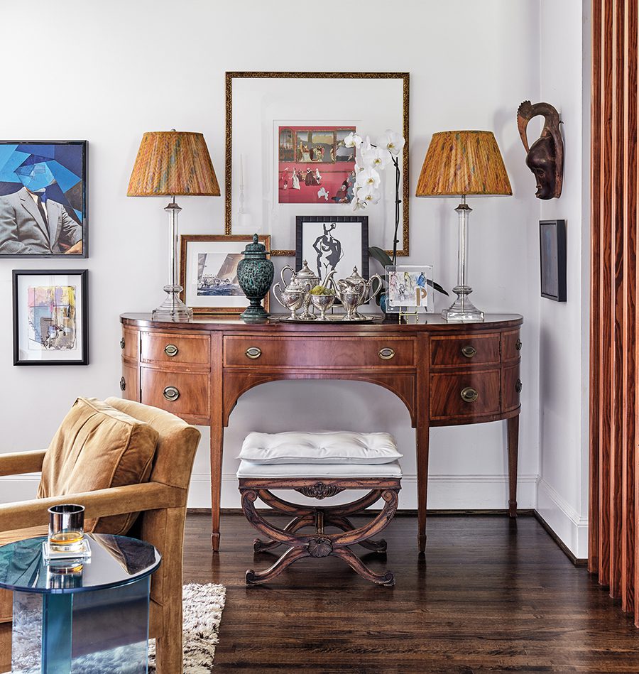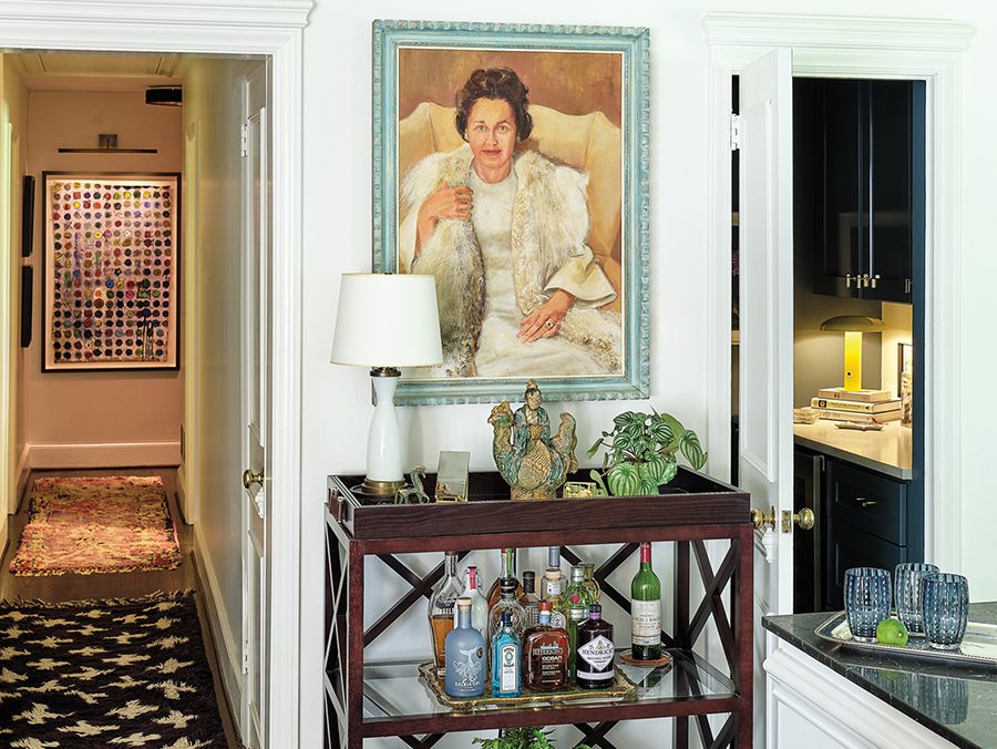 Just beyond the entry, a painting of Walter’s beloved grandmother hangs above a console table that doubles as a bar. The portrait was painted by Walter’s step-grandfather, an English professor and true Renaissance man whose hobbies included art, music and poetry. Beneath the painting sits a ceramic Asian sculpture, another heirloom from Walter’s grandmother. The bronze Etruscan horse is a souvenir from Rome, a frequent destination for the Pringles because of dear friends who live there. A small slab of rock shaped by oxidized iron, so intricately detailed it reminds Pringle of a city skyline, also sits atop the bar. She picked it up at a shop in Paris just around the corner from the Hotel de Buci, where she and her sister, Tracy Dart, have befriended the concierge.