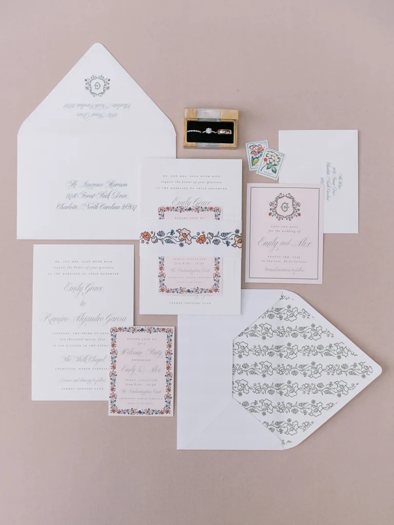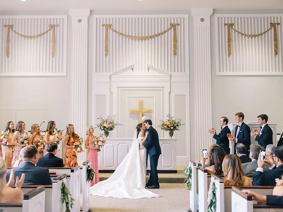 For Emily and Alex, their wedding centered around celebrating with the people they love most. A longtime family friend and pastor married the couple — who met as sophomores at UNC Chapel Hill — at Belk Chapel. Alex wore a custom suit with ram cuff links for their alma mater, and Emily wore her sister’s wedding earrings. “It was a beautiful ceremony,” says Emily, a Charlotte native. “Personal and pointed toward Christ — just how we wanted.”
