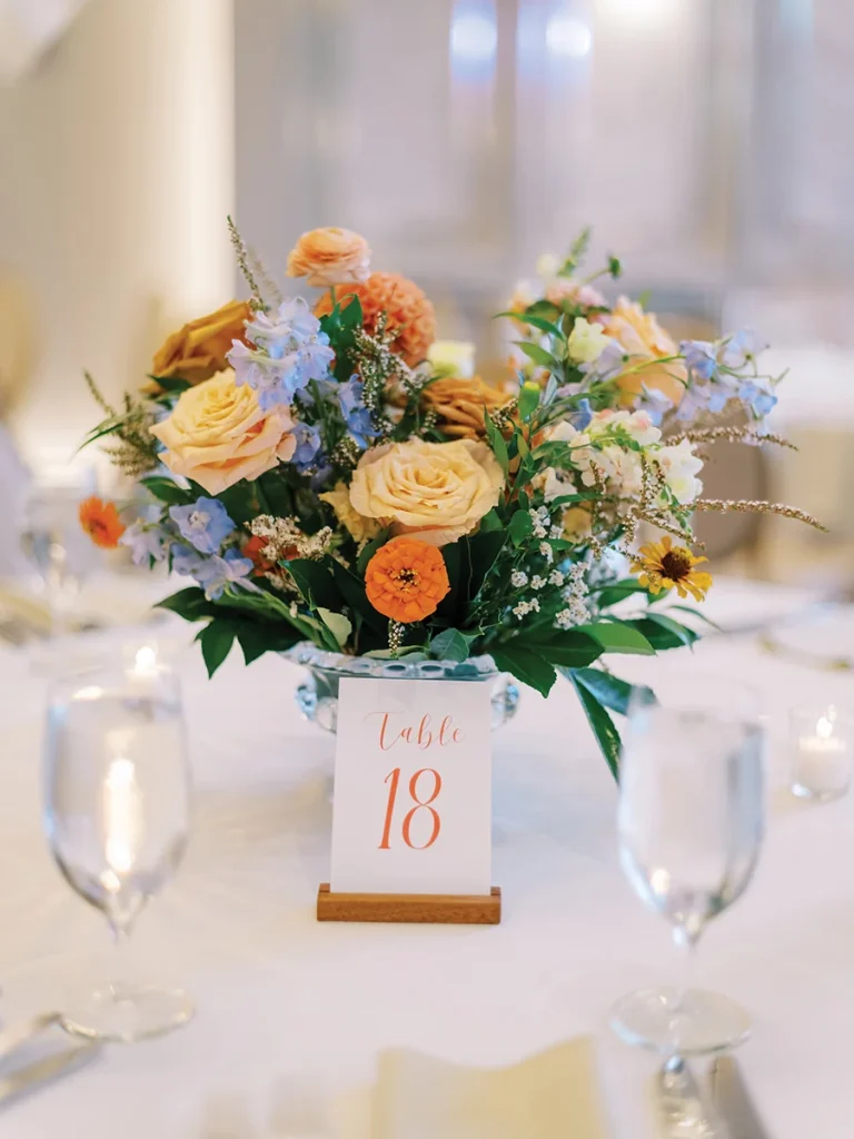 The reception was at Carmel Country Club, where Emily’s family has been members for over 20 years. The flowers — dahlias are a favorite — were an important detail to the bride, who wanted to incorporate plenty of color. “Essentially I wanted the flowers to reflect the mood of the day: happy, joyful and fun.”