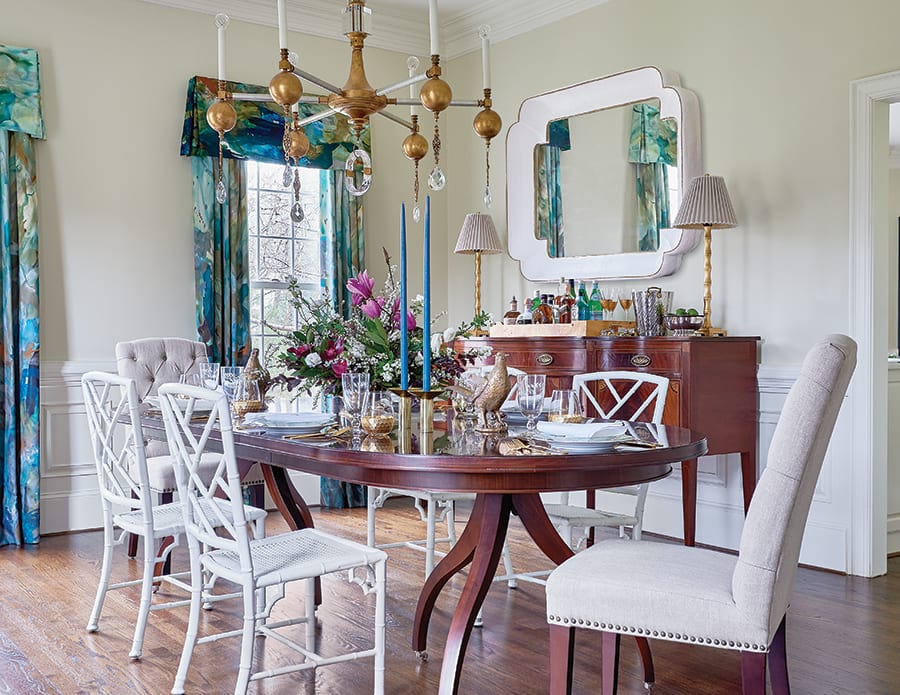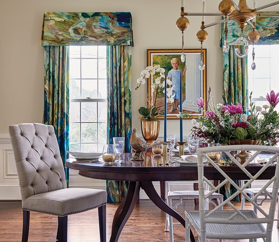 For the dining room draperies, a colorful custom fabric by Charlotte artist Windy O’Connor sets an elegant tone for the spacious room. The ornate lucite and crystal chandelier is handmade by Raleigh artist Louise Gaskill. The Hickory Chair dining table and upholstered chairs are accented by white powder-coat metal chairs purchased at an antique store in Greenville, S.C.