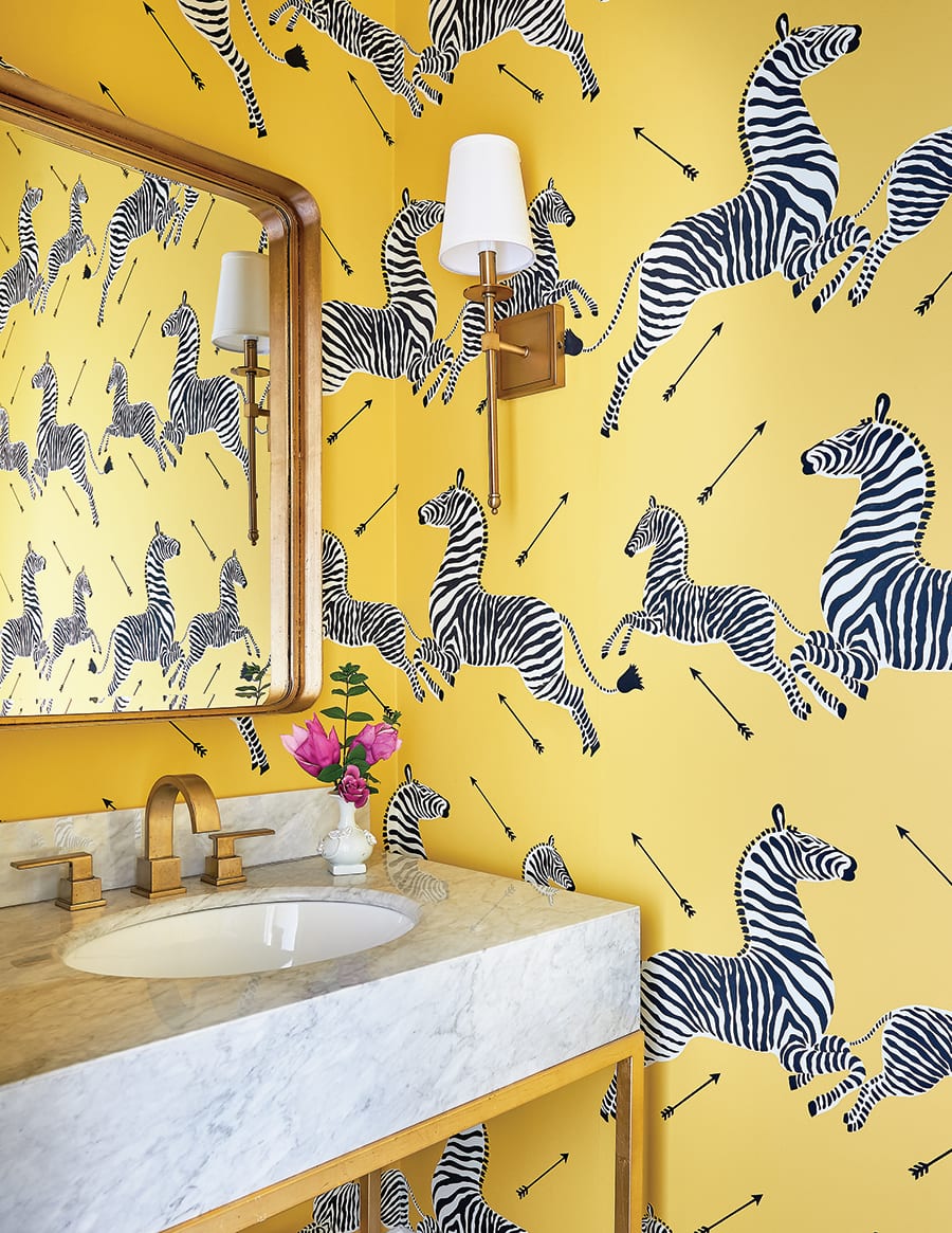 The half bath near the kitchen is brightened by a Scalamandre zebra-print wallpaper in a cheerful yellow. “We wanted this bathroom to be fun and playful, because the children use it the most,” Westerman explains. “It is right next to their drop zone at the back door.” The brass fixtures and marble countertop are stylish yet durable.