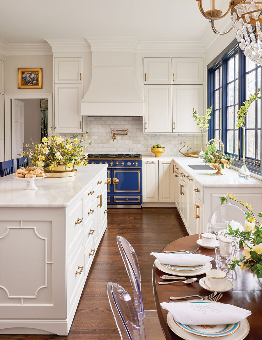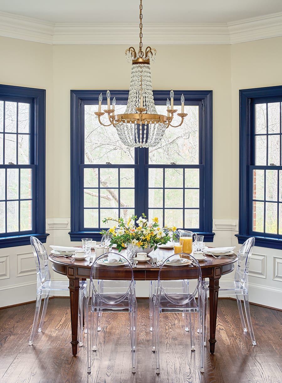 Westerman worked with Vinyet Architecture to create a more functional and flowing kitchen area. The addition of a bay of windows above the sink allows more natural light. The walls and cabinets are painted a clean, creamy white, while the trim and barstools are a navy blue to complement the La Cornue range. Traditional and modern pieces strike a balance in the bright and airy breakfast nook, anchored by an heirloom table flanked by transparent ghost chairs.