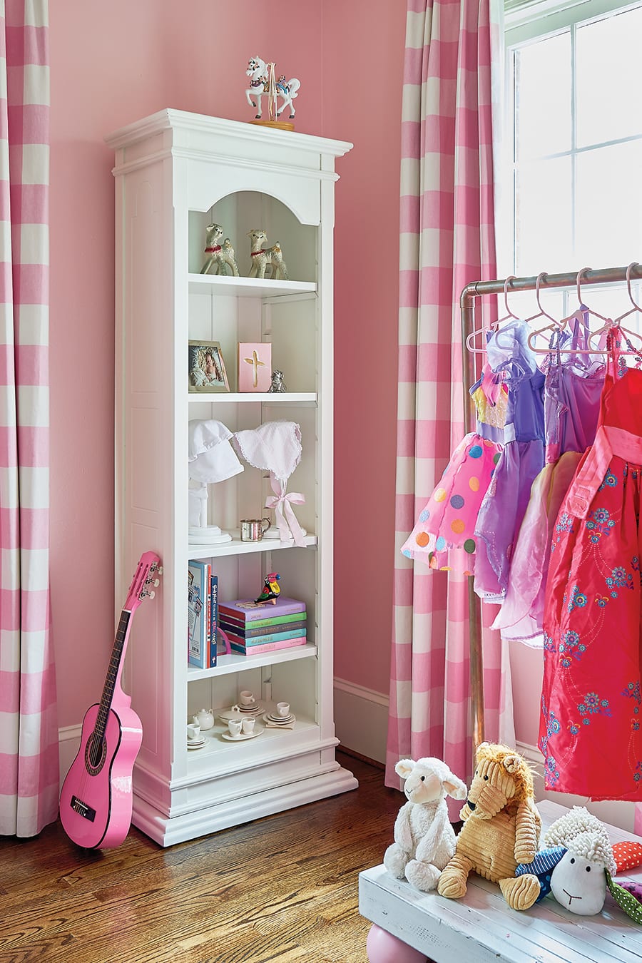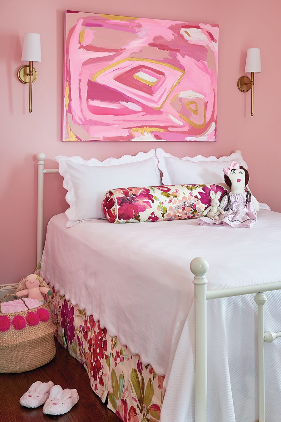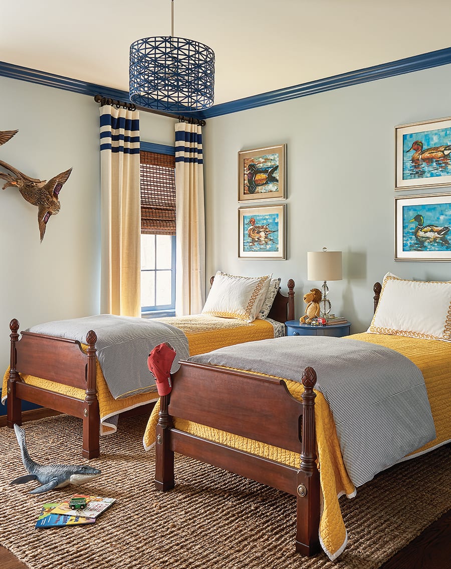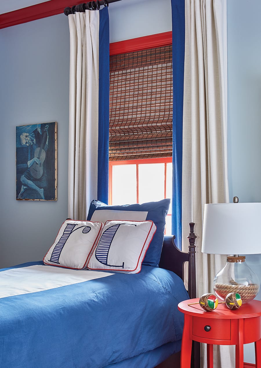 The colorful yet comfortable theme continues in the den and the children’s bedrooms. Westerman’s goal was to match the bedroom themes with the children’s personalities — a soft pink for the young daughter and boyish blues with contrasting pops of red or yellow for the sons’ rooms.