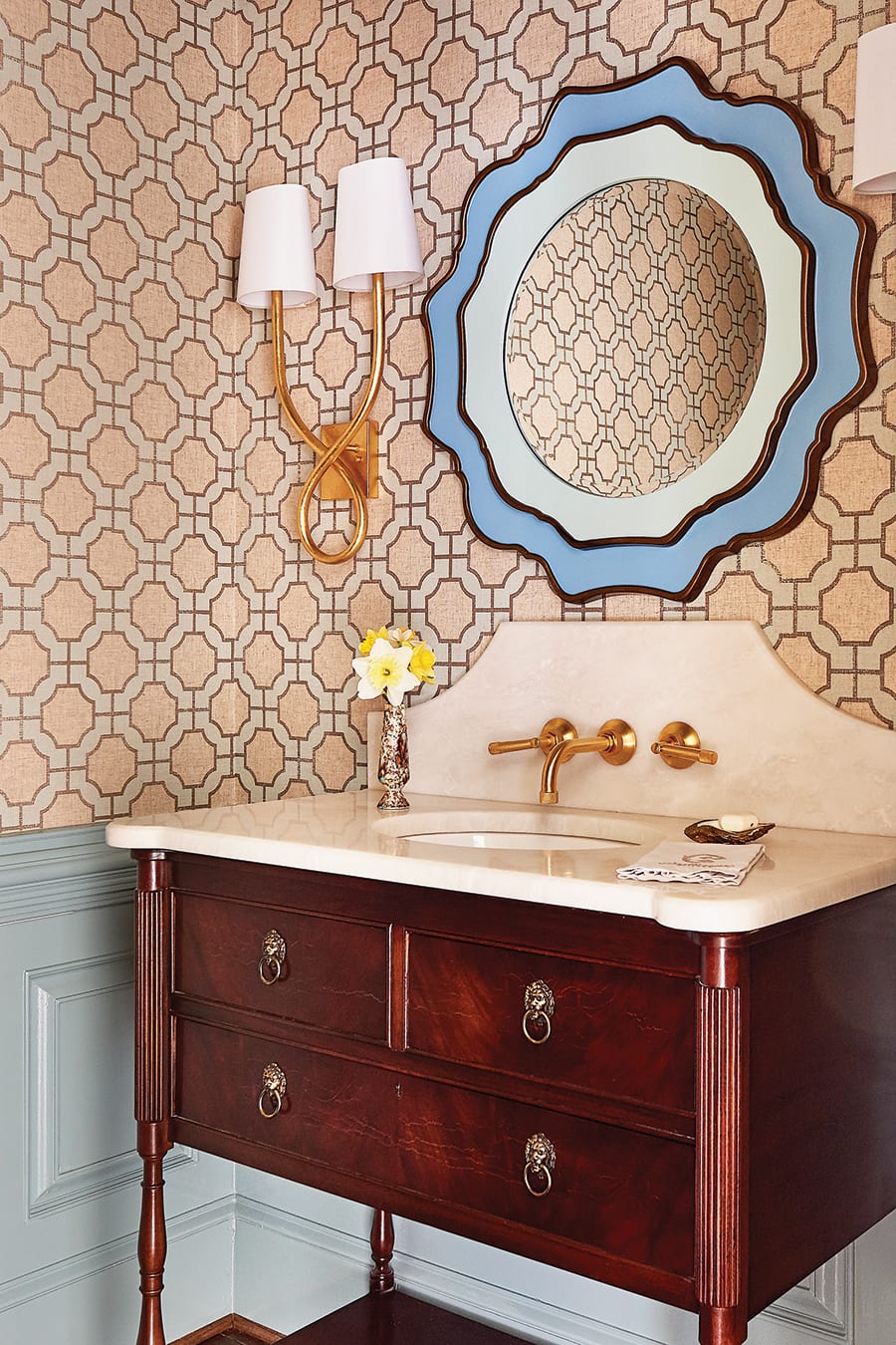 For the more formal powder room near the front entrance, Westerman selected a soft blue and beige hand-stamped grasscloth by Philip Jeffries for the walls and a complementary shade of high-gloss blue for the trim. In lieu of a traditional sink, an antique wooden console was transformed into a marble-topped vanity, adding a touch of glamour to the intimate space.