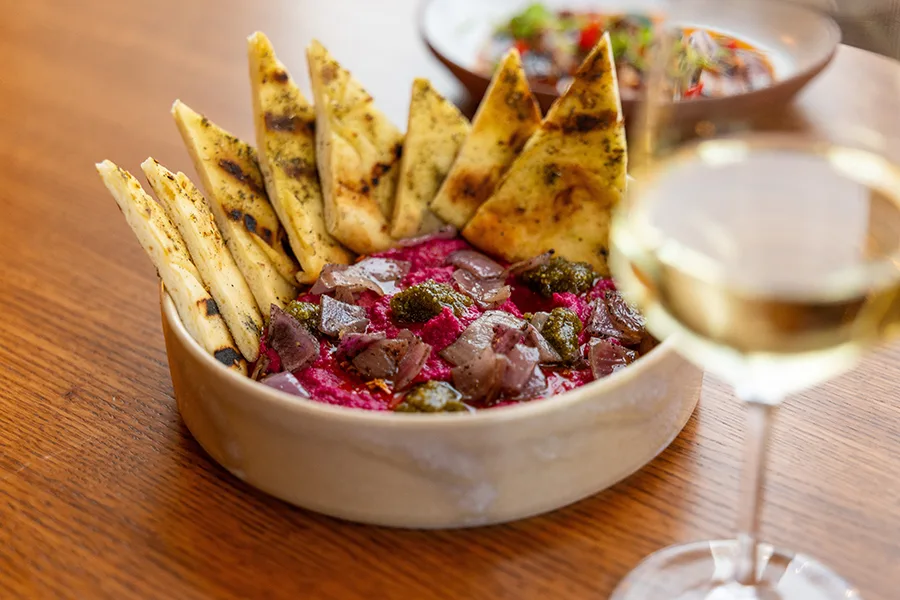 Starters include Firecracker Shrimp, Fried Cauliflower and the Beet Hummus, a bright, garlicky appetizer served with grilled naan that’s big enough for sharing with the table. Another light appetizer is the Hamachi Crudo, with Calabrian chili oil for a hint of spice and dollops of avocado mousse and sweet peppers to balance the heat.