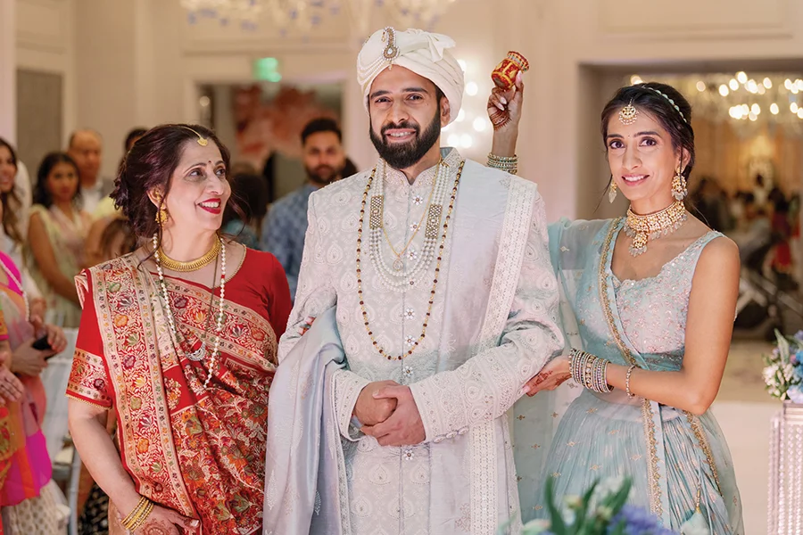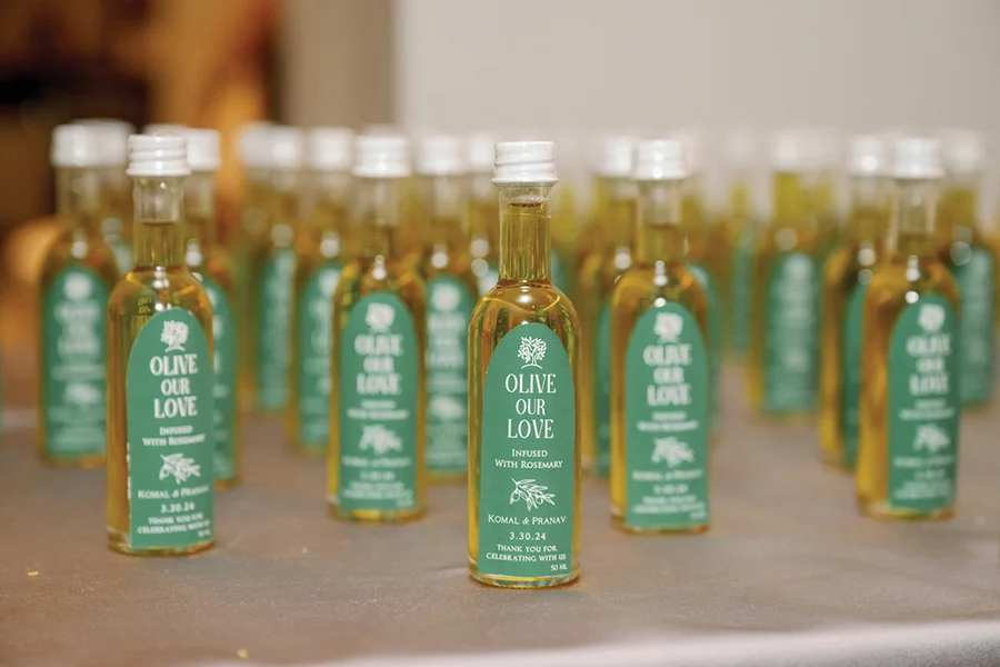 The joyous Indian celebration included a welcome party at Hi-Wire Brewing and pre-wedding rituals such as the haldi, mehndi and baraat, the groom’s wedding processional. The couple opted not to do a first look, preferring to wait to see each other at the mandap (altar). They chose an Italian theme for the reception — a nod to their favorite cuisine and their Italian honeymoon — and gave guests bottles of rosemary-infused olive oil as favors. Relatives entertained the couple with special toasts and surprise choreographed performances. “When you’re planning, you can get consumed by the logistics, but when all of your loved ones are in one place, the happiness and joy are magnanimous,” Komal says. “Things may go wrong, but it’s the energy, happiness and love all around you that you’ll remember most.”