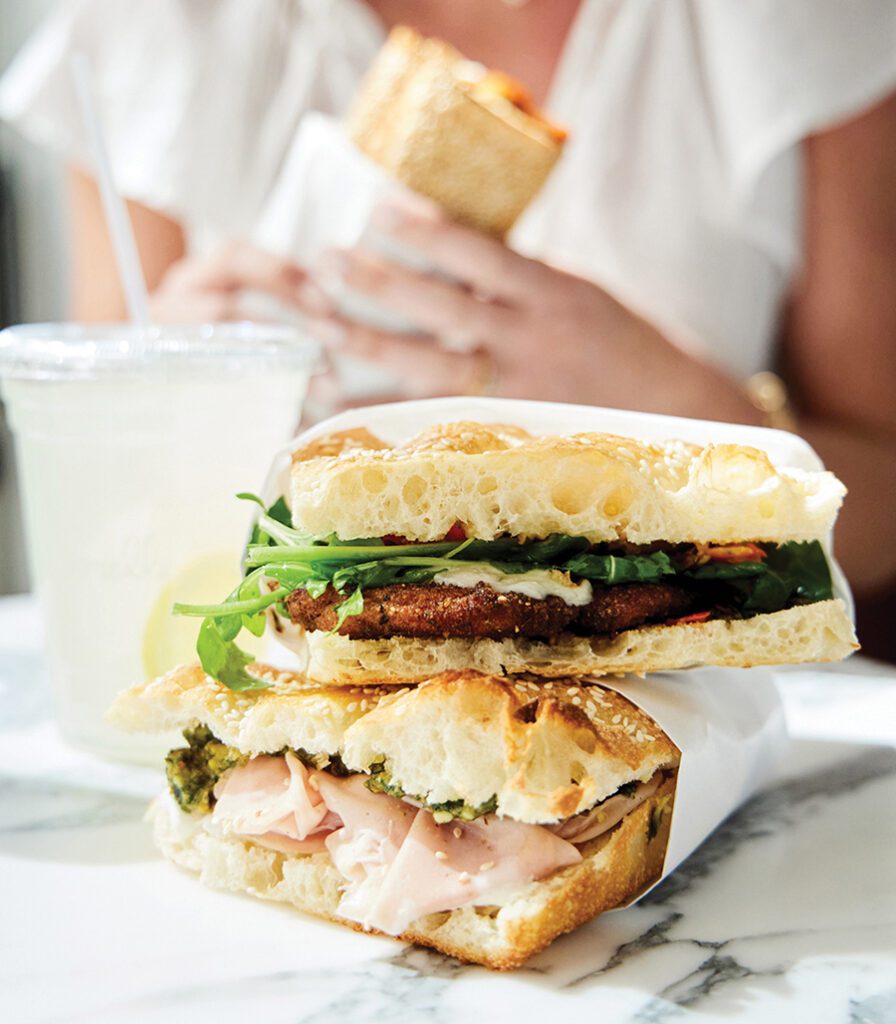 Outside, a gussied-up side alley hums with the happy chatter of people sharing a bite to eat, while the bakery’s mobile wood-fired pizza oven is in full swing. As if this little bakery needs anything else to add to its charm, a blue retro bicycle with a basket rests underneath the shop’s colorful mural.