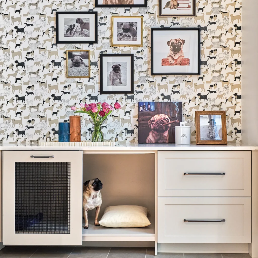 A stunning gourmet kitchen is equipped with high-end appliances, custom cabinetry and a massive center island. For those who enjoy entertaining and relaxing in a more informal setting, the main level also includes a card room, bar and rec room, where you’ll find a 12-foot masonry fireplace for cozy nights. There is a black marble fireplace in the sleek home office too, a bold space boasting moody hues and a snakeskin ceiling. Pets, don’t despair, there’s a place for you, complete with a water-filling station, storage for pet supplies and a comfy hideout to rest. Nearby, the laundry room, drop zone and sleek scullery ensure efficiency for everyday tasks.