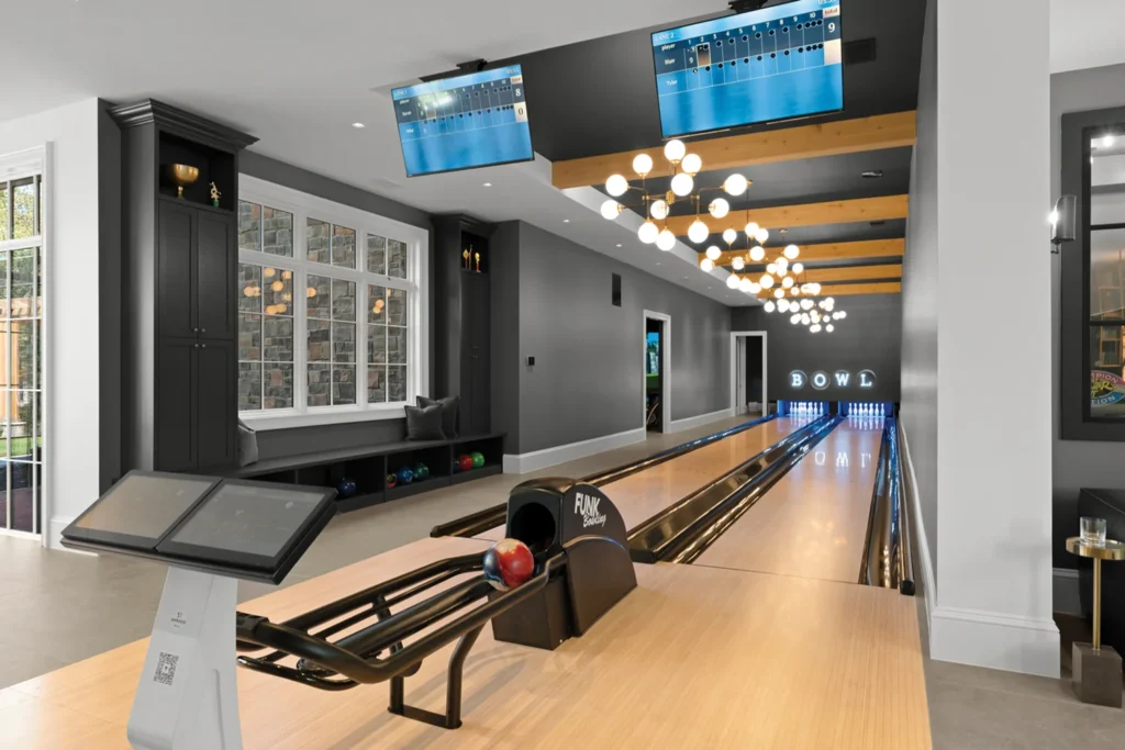 Venture downstairs and you’ll discover a recreational paradise. Like to bowl? You can do that in a regulation-sized, two-lane bowling alley. Prefer ping pong, pool or arcade games? You can do that, too. In the simulation room, practice 100+ sports (from golf to beer pong), or enjoy a show in the state-of-the-art home theater that comfortably fits 16.