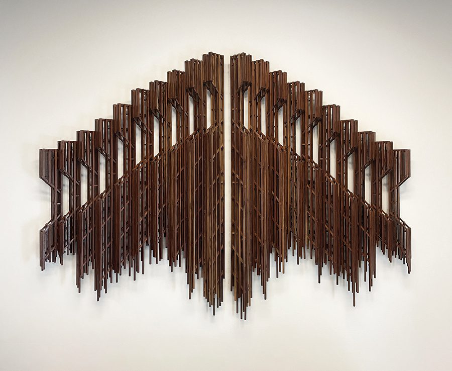Left: Noir no.2, 2023, walnut, 23-gauge nails, 47 x 73 x 4 inches. Right: Telophase no. 1, 2022, oak and 23-gauge nails, 72 x 24 x 24 inches. Commissions through Hodges Taylor.