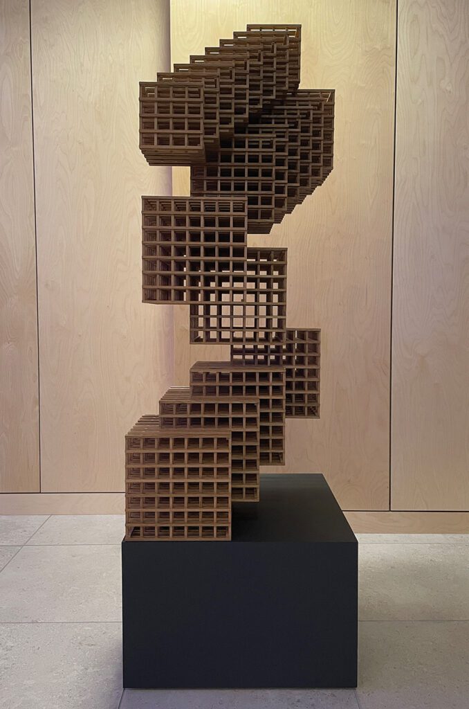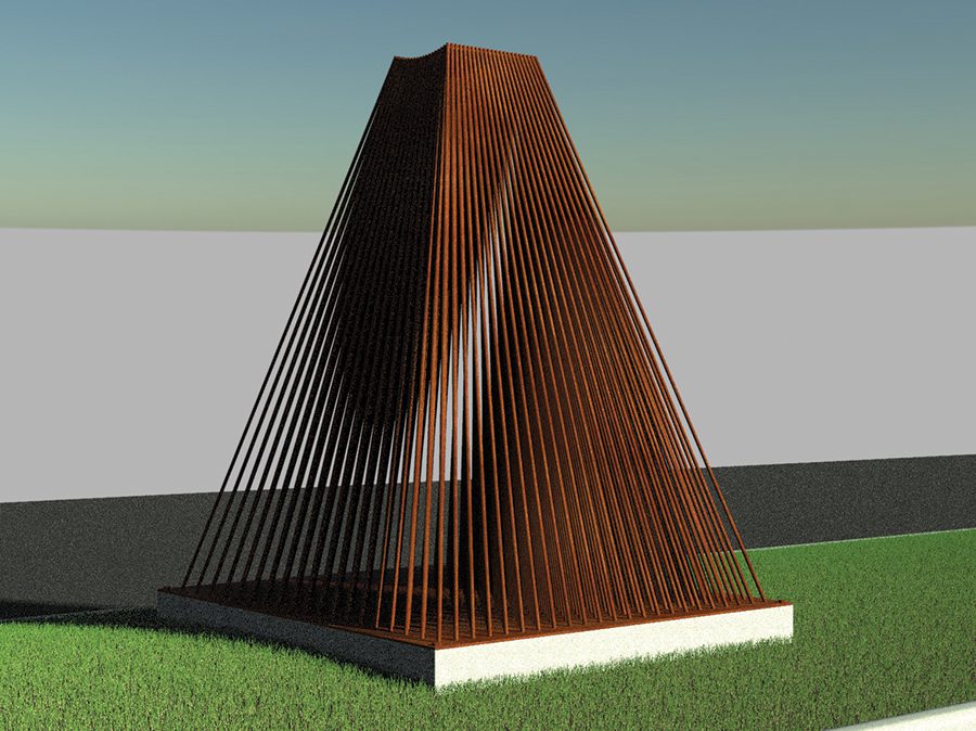 He began to experiment with steel rods and developed the design for what will become a 10-foot-tall, 6-ton piece of steel rods. Slated to be installed in 2026, the piece will be a sort of pyramid of rebar, where slivers of daylight will shift with the movement of a viewer.