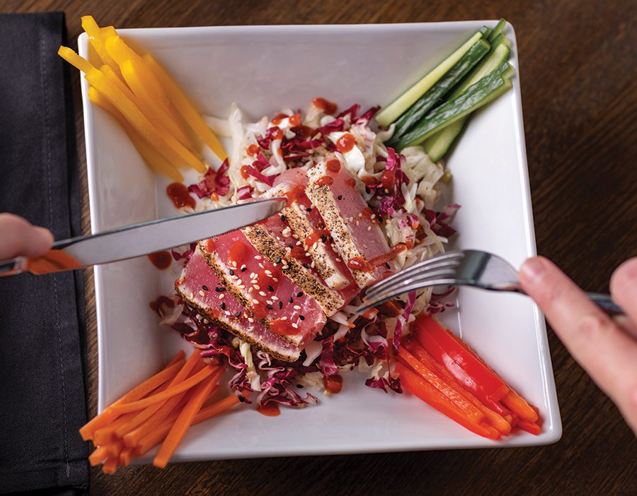 Chef Thomas Carrig’s menu is fresh, creative and full of flavor. Choices are plentiful, and there is always an option to create your own custom “H3 Plate” — choose a protein, vegetables, starch and sauce. A sample of menu items during my stay included watermelon and avocado salad with lime juice, feta jalapenos and mint; a panko-crusted eggplant Parmesan stack with pesto, marinara, mozzarella and sauteed asparagus; and a sushi bowl with seared ahi tuna, brown sushi rice, edamame and cabbage with ginger-soy dressing, cucumber, avocado and carrots.