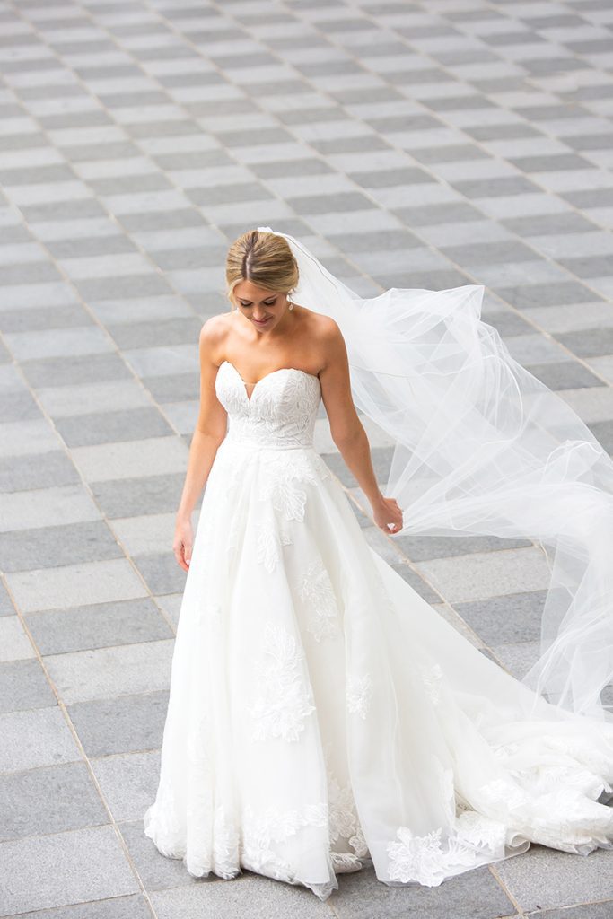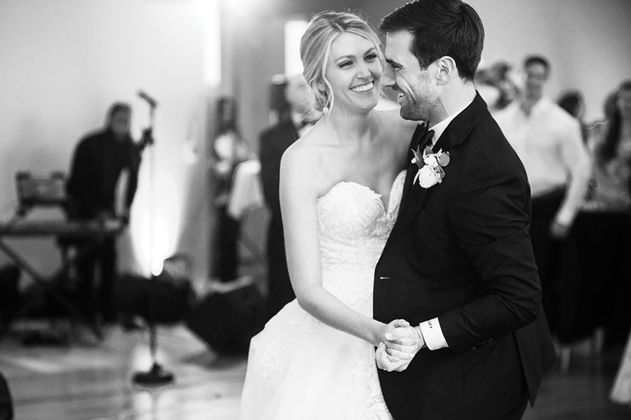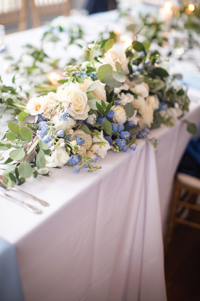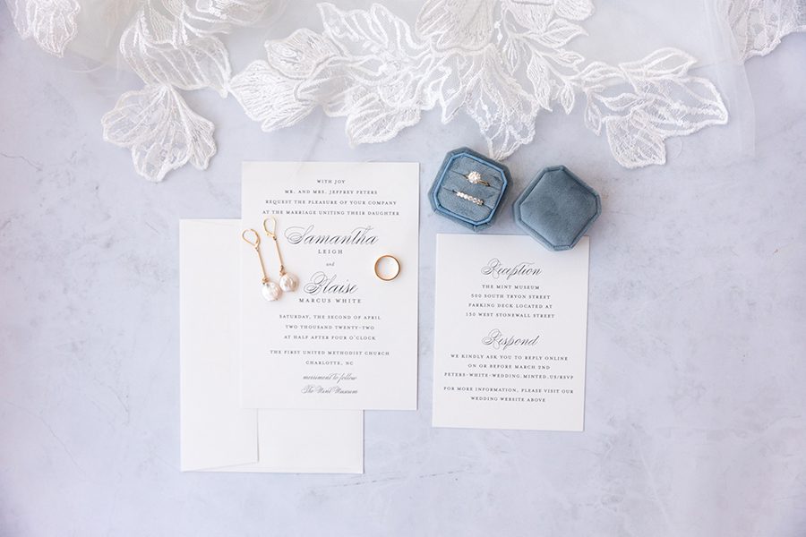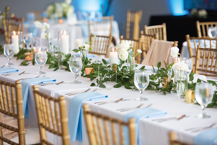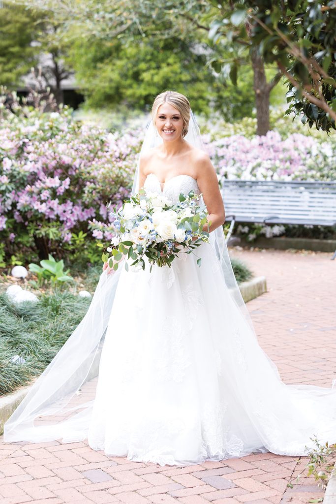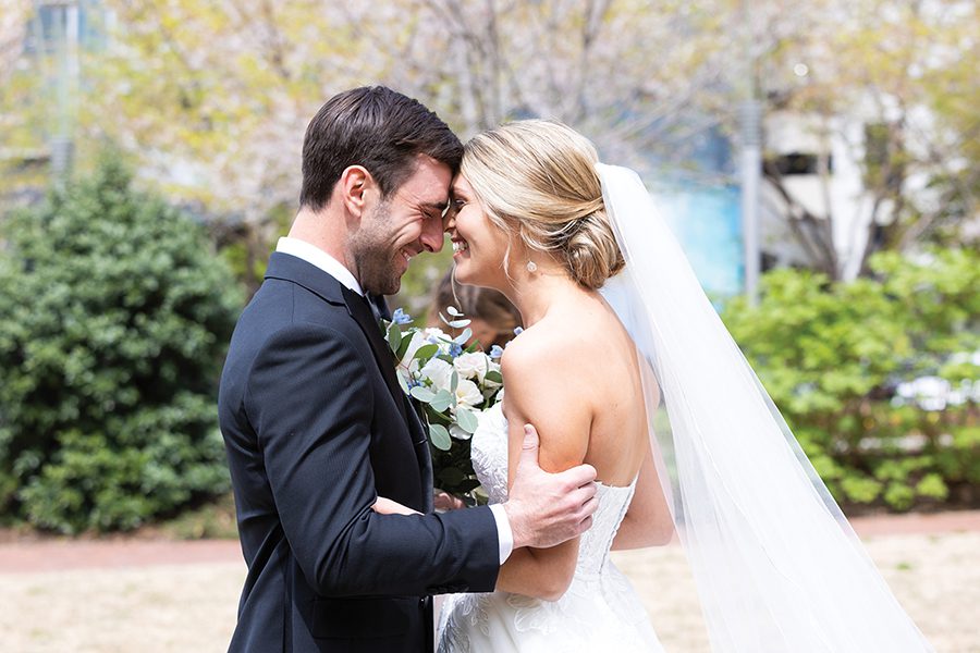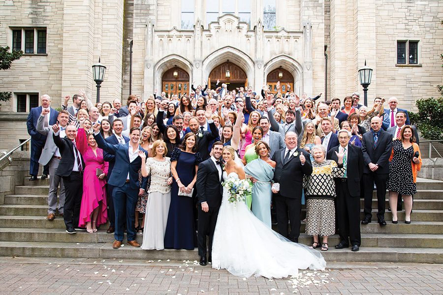 Sammy and Blaise are a couple who get sports. Blaise is a former basketball player at Birmingham Southern College, and Sammy is an Auburn University grad well-versed in in-state rivalries. So when their wedding fell on the historic UNC-Duke matchup during the NCAA Final Four, they knew they needed a TV at the reception. “I have plenty of Carolina fans on my side of the family; my husband of course, is a Duke fan though,” says Sammy, who grew up in south Charlotte. “Dancing with all your friends and family while simultaneously cheering for a rivalry game was memorable.” The couple, introduced by mutual friends and both physician assistants in Atlanta, envisioned a color scheme that was “clean and crisp.” Ironically, they had picked blue and white. Deciding on a traditional wedding party was more difficult, fearing they would leave out someone they loved. Instead, Blaise had three “best men,” and Sammy, two matrons of honor. She asked a close group of friends to wear pastels or spring florals, take photos and get ready with her before the ceremony. Following the couple’s exit from the church, Blaise had the idea for guests to gather on the steps and join them for a group picture. “That is by far one of our favorite photos,” Sammy says. “At the end of the day, this day is all about you and your spouse starting your marriage … Break what you think is the mold and make things work for you.”