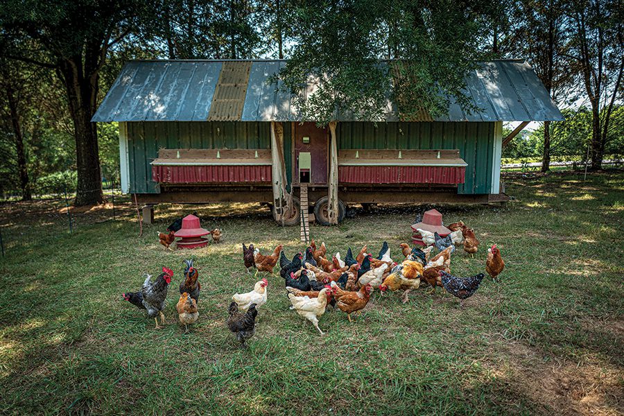 A moveable chicken coop, center photo, at New Town Farms in Waxhaw produces fertilizer for the large oaks owner Sammy Koenigsberg and his father planted years ago and compost for use in the fields. Birds are separated between “egg layers” and those grown for the meat. It’s the “dual-purpose” breeds, as Koenigsberg puts it — heirloom birds like Black Australorps, Dominiques and Rhode Island Reds that produce both eggs and plump meat — that are disappearing from the American farming landscape. “Those were a part of the old small farm America,” he says.