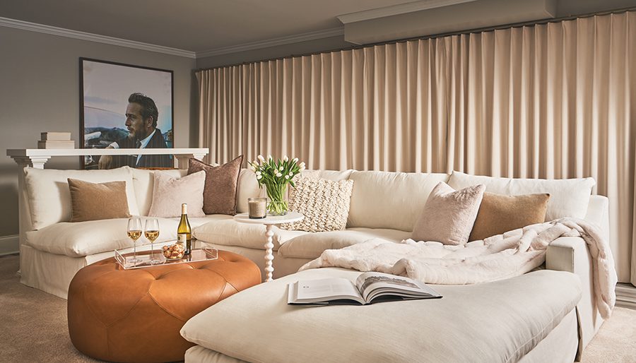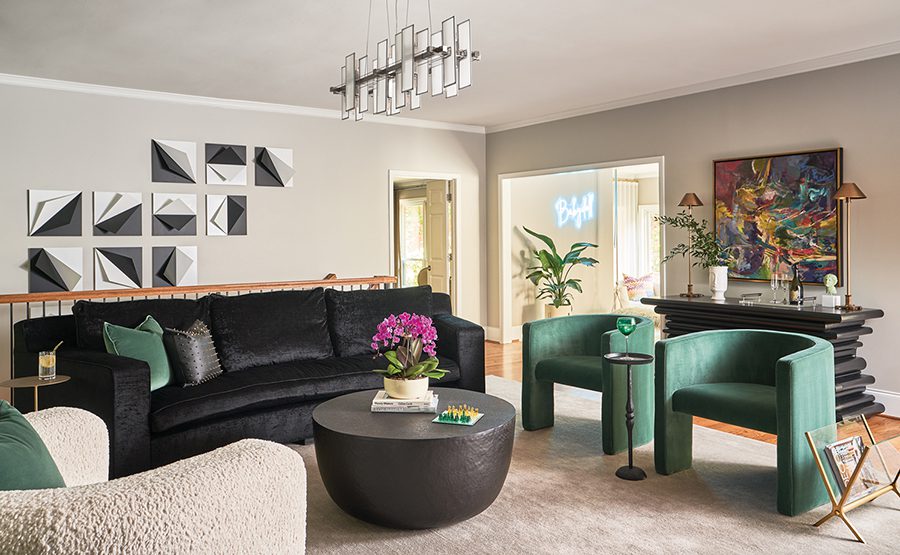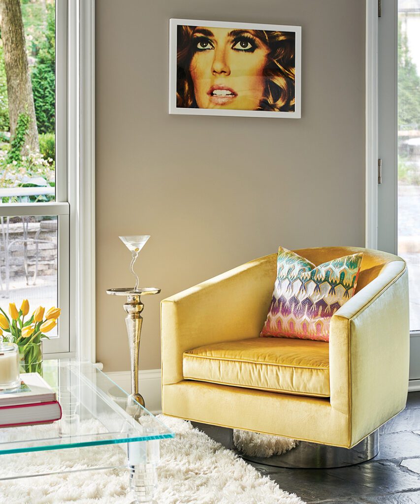 The couple also enjoys entertaining. With Cagle’s help, the basement, with a drop-down projector, is now a comfortable and stylish spot for movie night with friends. To accommodate a crowd, Cagle added a bar behind the custom sofa for extra seating. A Paul Newman print is a nod to the first movie the couple watched together.