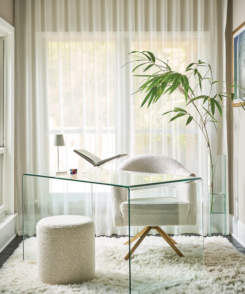 On the opposite side of the room is a clean, modern office space for Gallant, who works from home and appreciates the room’s natural light. “One of the things I love about the house is the windows,” she says. “You’re so in touch with the outdoors.”