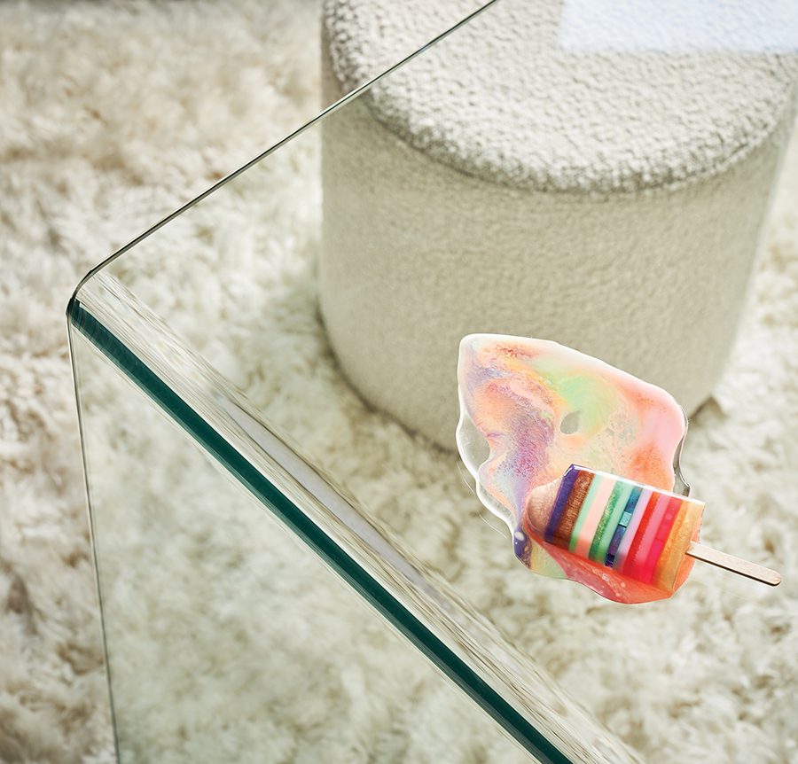Right two images: Popsicle sculpture by Betsy Enzensberger, top. A chic work-from-home space with a glass waterfall desk, below.