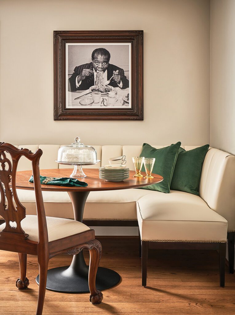 In the breakfast nook, a custom banquette is paired with the homeowner’s existing chairs and a pedestal table by Nuevo. The print is Slim Aarons’ “Dinner Jazz” featuring Louis Armstrong.