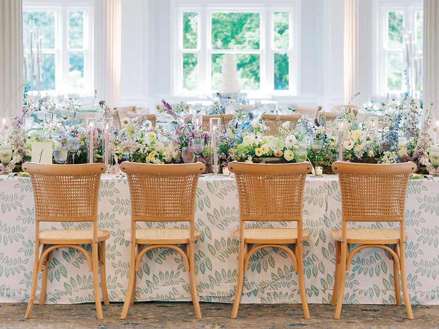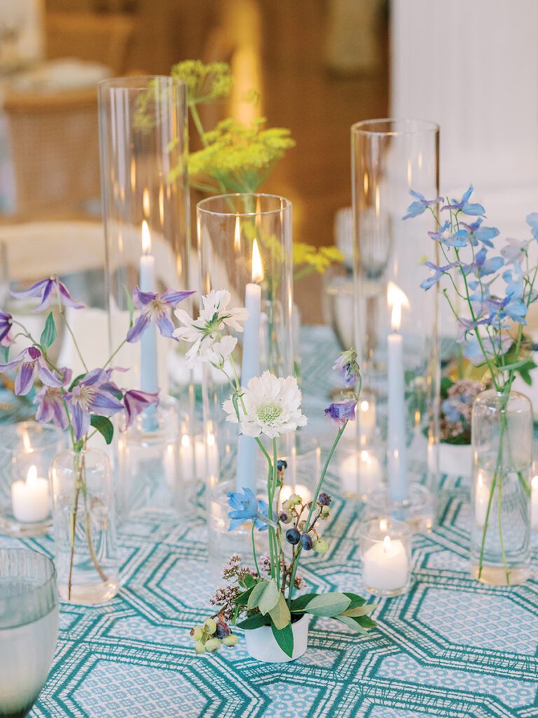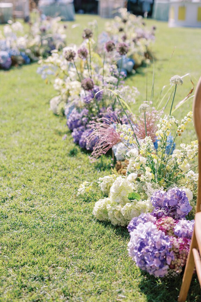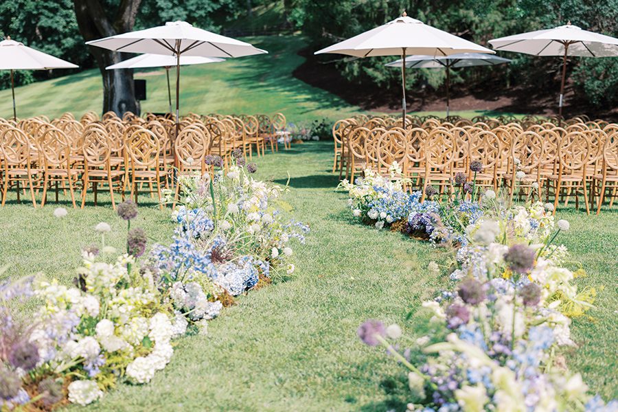 Planners Lindsay Kennedy and Stephanie Murtaugh aimed for a wedding that felt like a “stylish summer retreat in the mountains.” They created varied, layered tablescapes, mixing in patterns and playful details like fan menus with tassels and touches of bows. For the ceremony, a serpentine floral aisle, sailcloth umbrellas and a floral focus in front of the wedding party added to the charming vibe.
