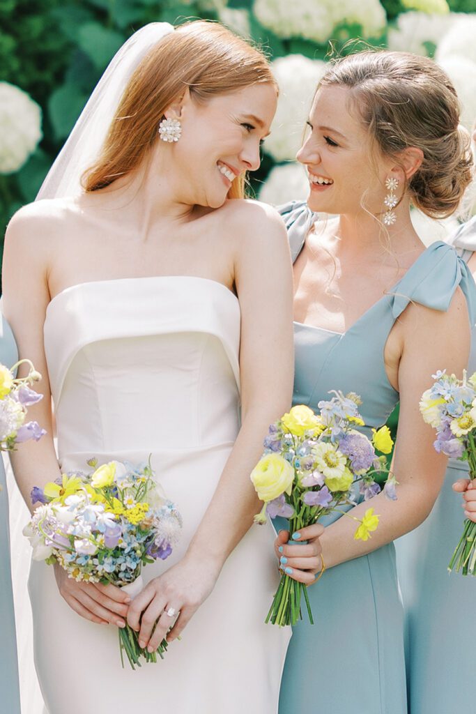 Wedding flowers included ones grown by Bailey’s sister-in-law, a surprise coordinated with the florist to ensure the colors matched the wedding palette. Bailey’s bouquet featured a white tulip — a nod to the couple’s courtship, when Jake would always arrive with a handpicked tulip. Tied around the bouquet: Bailey’s grandparents’ and great-grandparents’ wedding rings. To honor family members who couldn’t be at the wedding, Bailey, her mom and Jake’s mom wore bracelets Bailey had made featuring the loved ones’ birthstones.