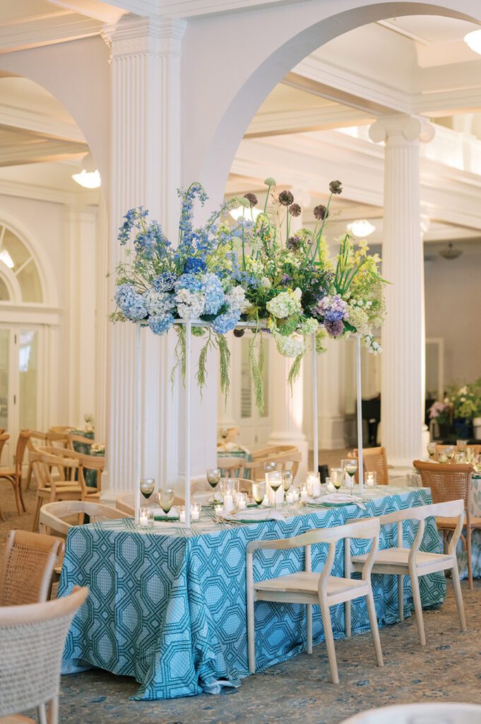 “This wedding was so colorful and full of patterns and textures, and we didn’t utilize a drop of pink,” Lindsay says. The resort’s storied architecture, along with the couple and their families, provided plenty of inspiration. “Their warmth, nurturing and just plain fun personalities had us wanting to design and plan something incredibly worthy of their love.”