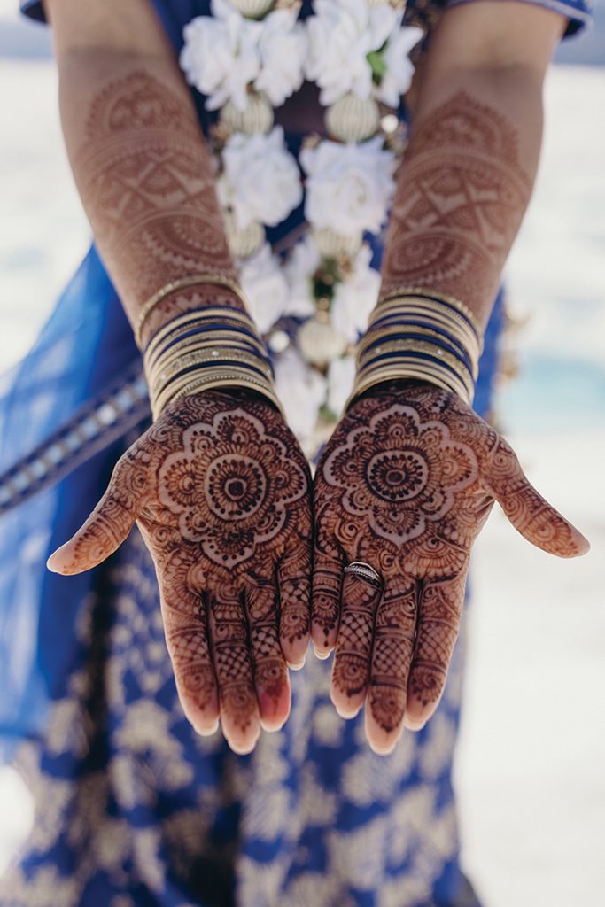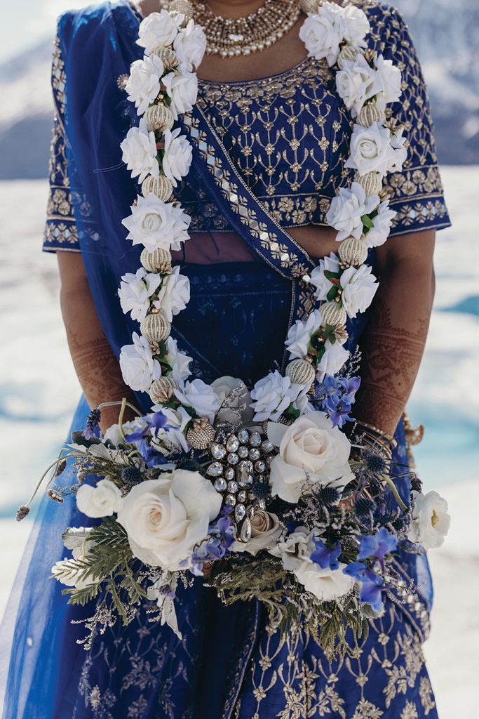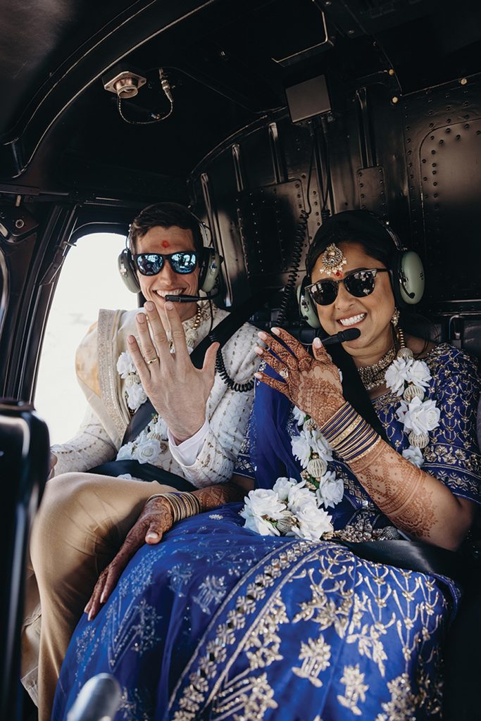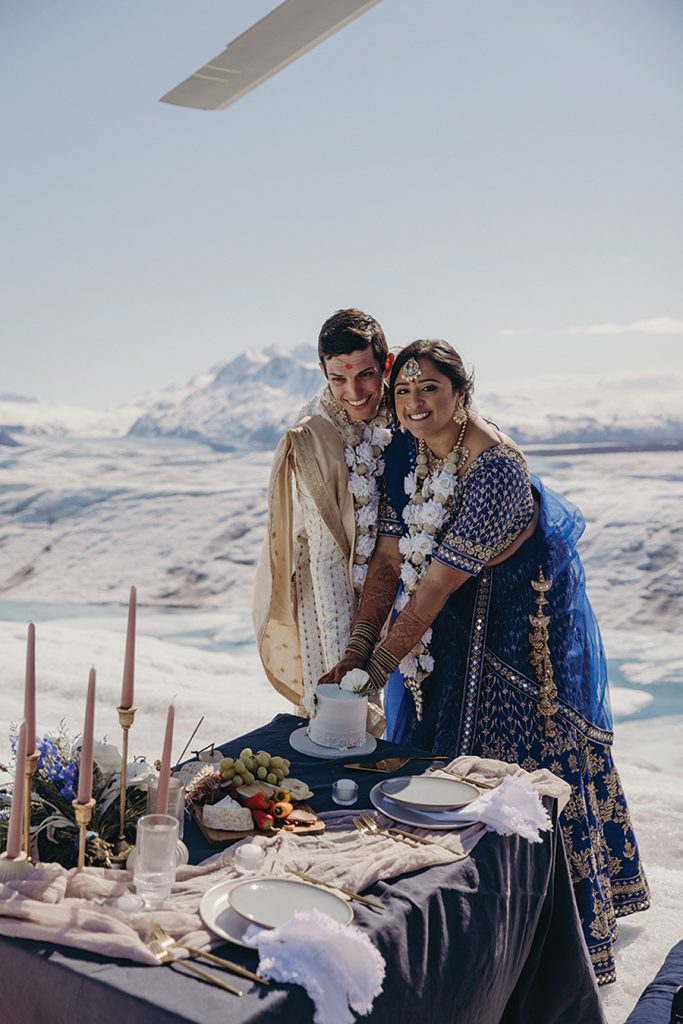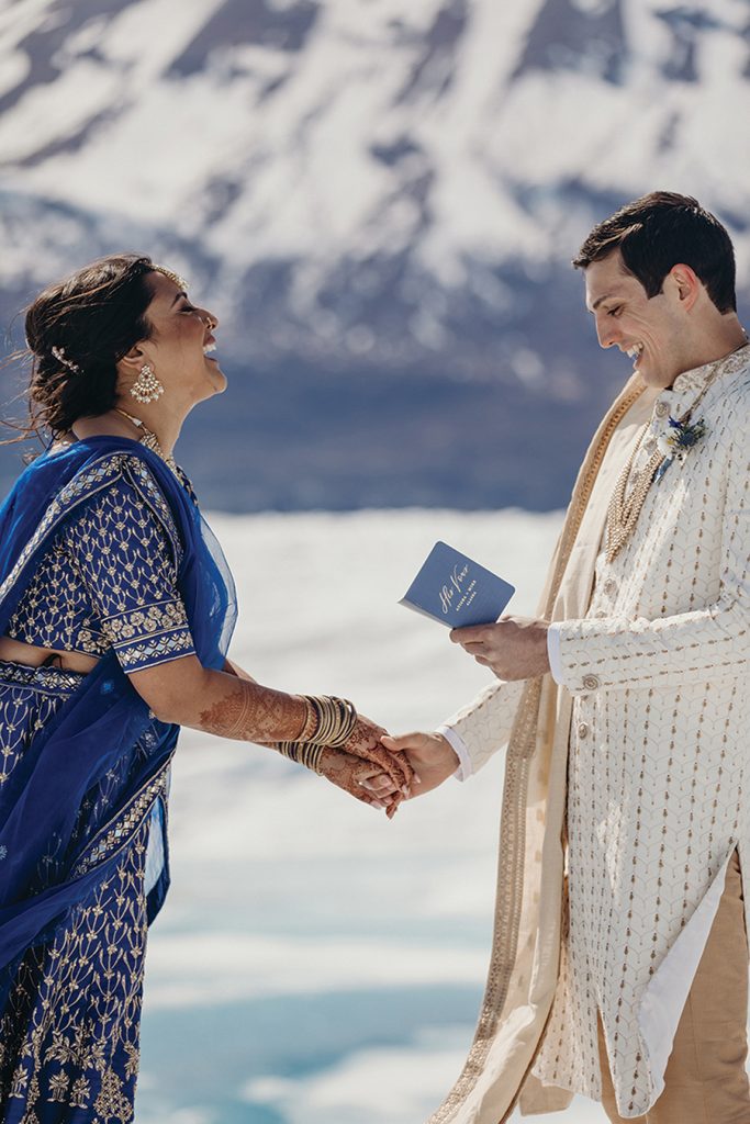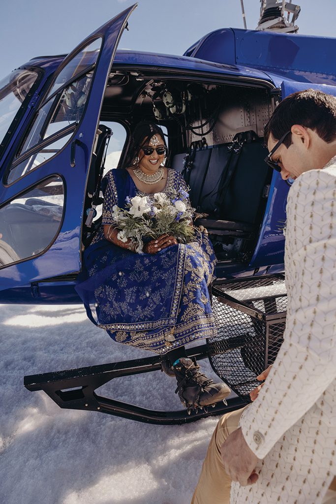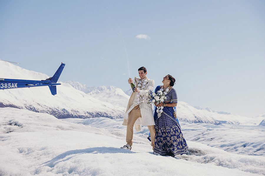 While they were dating, Atisha, a first-generation Indian American from a traditional Indian family in Anderson, S.C., and Mike, a “Southern gentleman” raised conservatively in Columbia, S.C., envisioned a big Indian wedding. Once engaged though, the Charlotte couple realized blending their different backgrounds into one conventional ceremony would be difficult. “These thoughts started to stress us both out and honestly make us sad,” Atisha says. “And weddings shouldn’t be sad!” They began researching elopements, eventually landing on an Alaskan “adventure elopement planner,” who presented an option for a helicopter ride to Knik Glacier and ceremony atop the 25-mile icecap near Anchorage. Sharing the news with family was awkward at first, but it helped when the couple shared videos of other elopements there. “Then they understood: It was so magnificent, who wouldn’t want to get married there?” Atisha says. Prior to eloping, the couple held small Pithi and Mehndi ceremonies — traditional Hindu ceremonies for good health and prosperity — and a “final fiesta” party the night before they left. After exchanging vows on the glacier, Atisha and Mike cut the cake, toasted with champagne and enjoyed a charcuterie board that included some Indian treats. They spent a week traveling through Alaska, with a stop in Salt Lake City on the way home to Charlotte. The couple have no regrets. “It was magical,” Atisha says. “It is your day. Your families will eventually get over it if you do not include them in certain things. They love you and support you … so just do what you want and what makes you and your groom the happiest.”
