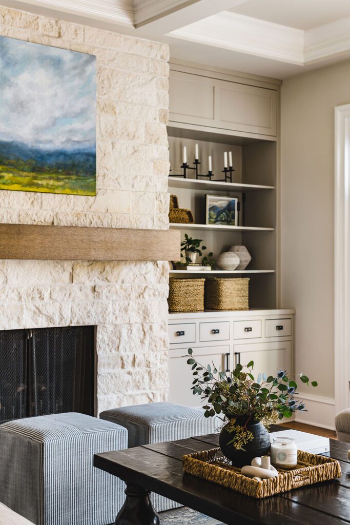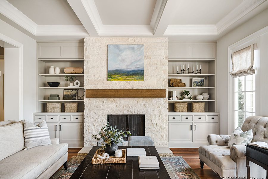 The fireplace is the focal point in the living room. A custom surround crafted of white stone with a floating wood mantel runs from floor to ceiling, flanked by custom built-in cabinets. The cabinets were designed with inset doors, four small drawers on each side, contemporary hardware, and a soothing paint color. “It’s a neutral that adds sophistication to the space,” the designer says. SP