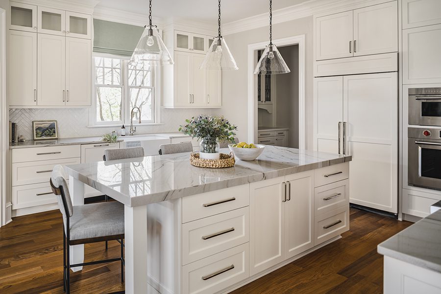 “The homeowners love to cook, so they wanted materials that they could use on a daily basis and not stress over the upkeep,” Bula says. Her solution: sealed quartzite countertops that can withstand high heat, along with a maintenance-free porcelain tile backsplash in a herringbone pattern to add texture and movement.