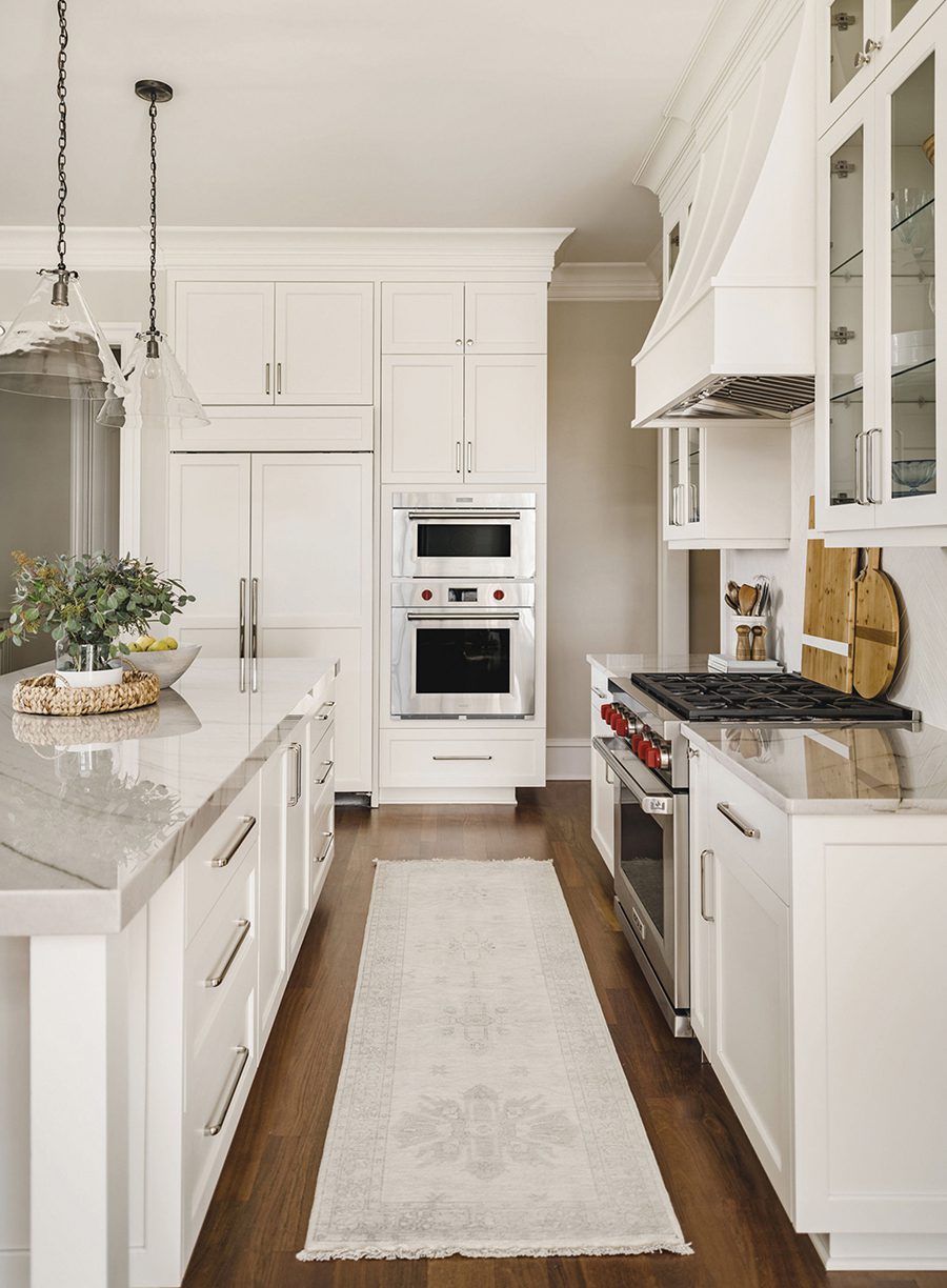 In the kitchen, the homeowners wanted a large island for guests to gather. The previous island had a dark wood countertop; the new one is topped with durable quartzite with a mitered edge. The Roman shade is by Chancery Custom, and the pendants are by Visual Comfort. The carpet runner is from Charlotte Rug Gallery, and the paintings are from Art House Charlotte.