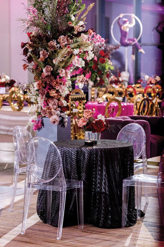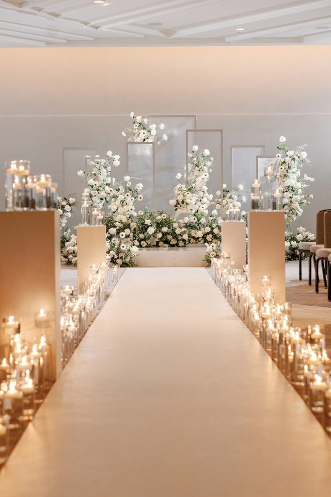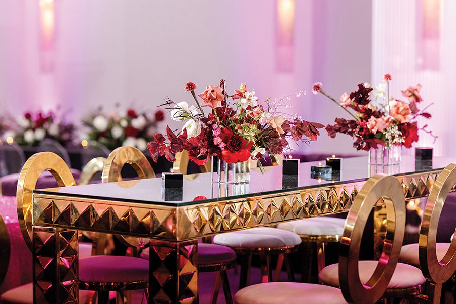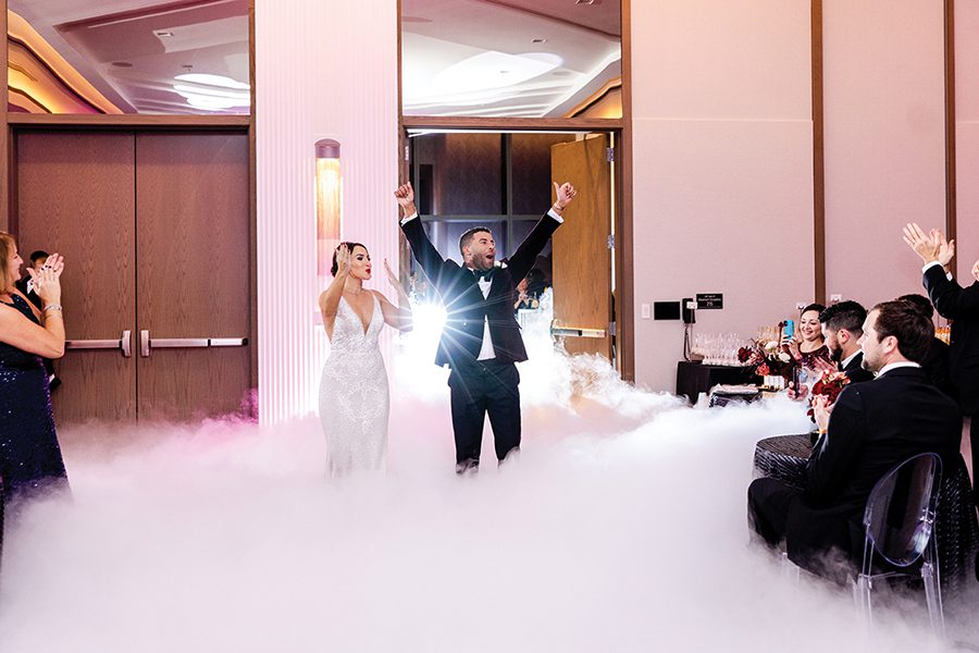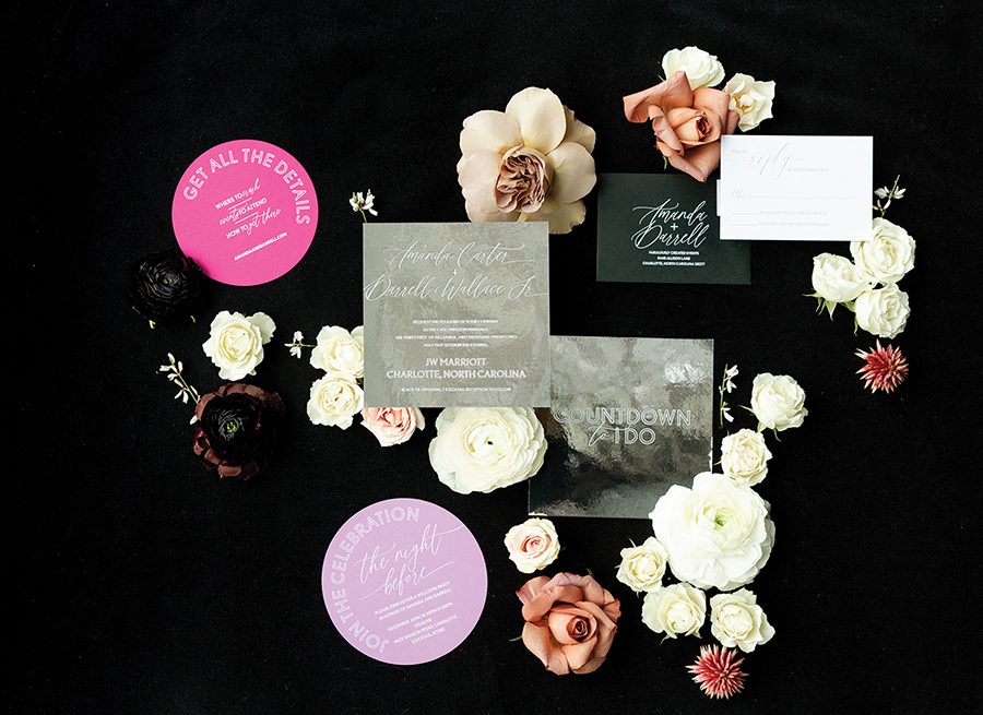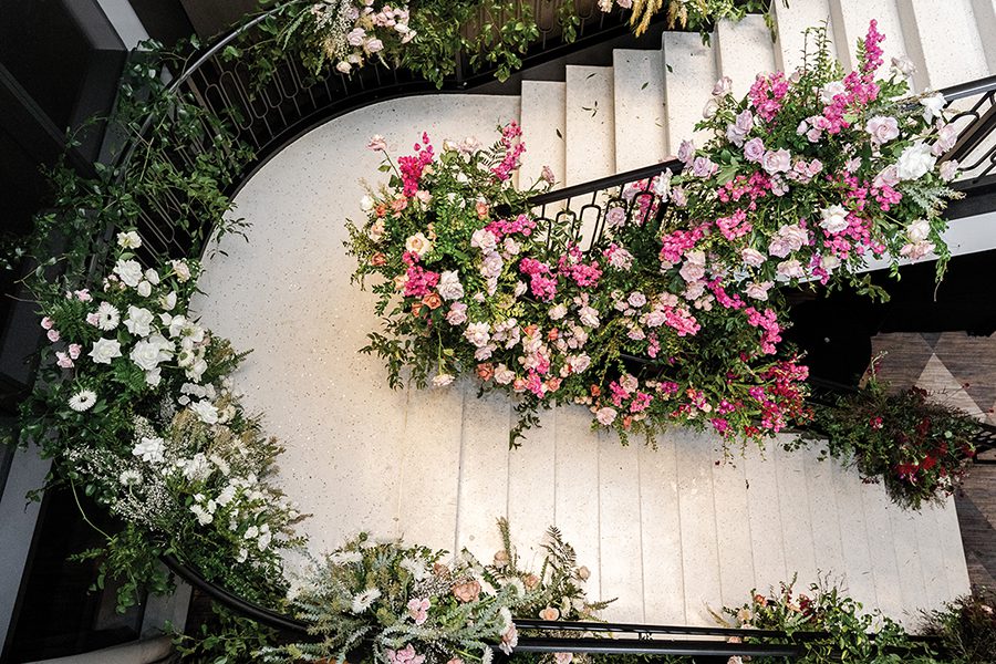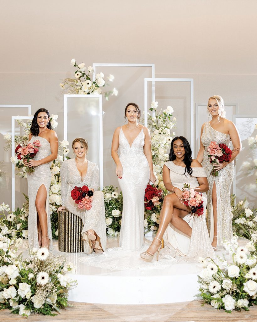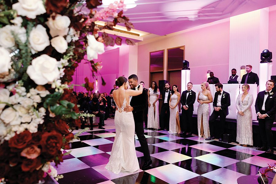 The couple knew New Year’s Eve was the ideal date to marry. Bubba, a NASCAR driver, has a short off season, from November through January. Wanting a venue that provided proximity for the ceremony, reception and lodging, they chose the JW Marriott Charlotte, aiming for a “romantic and sexy” ceremony filled with white flowers and countless candles. Florals — transitioning from white to pinks with pops of color — draped the staircase leading to the reception.