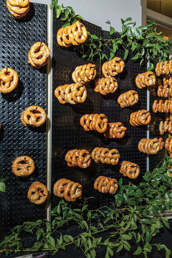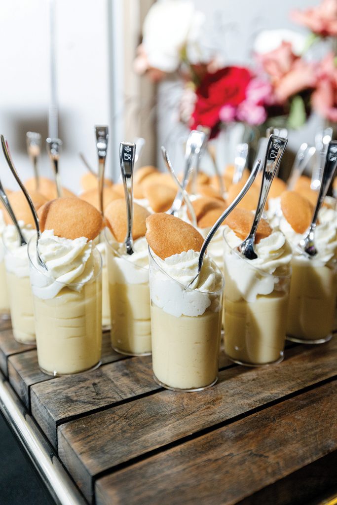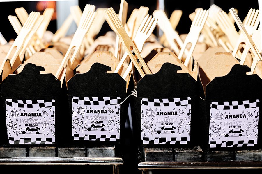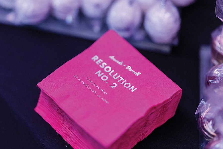 To spend as much time as possible with their 200+ guests, the couple opted for passed hors d’oeuvres and station-style food that included favorites such as tacos, burgers, Italian and Asian stir fry. Instead of a cake (Bubba does not eat desserts and the couple preferred something less traditional), a dessert table doled out goodies like cake pops, sugar cookies, macarons and banana-pudding shooters. Champagne flowed from two acrobatic performers, and sparklers and a Champagne toast helped ring in the New Year. To close out the evening, guests nibbled on chicken nuggets and fries from a McDonald’s food truck.