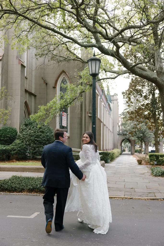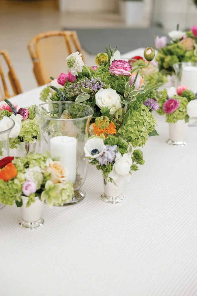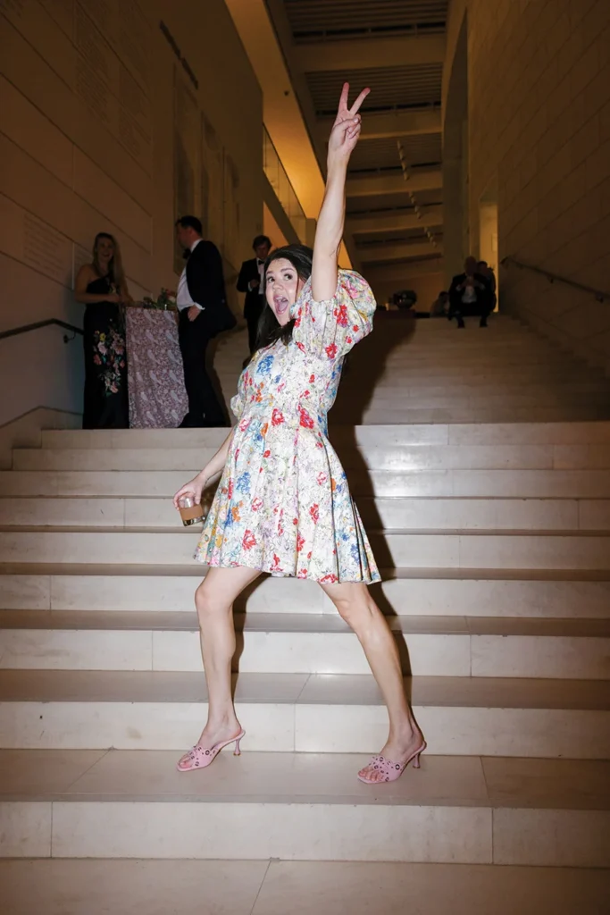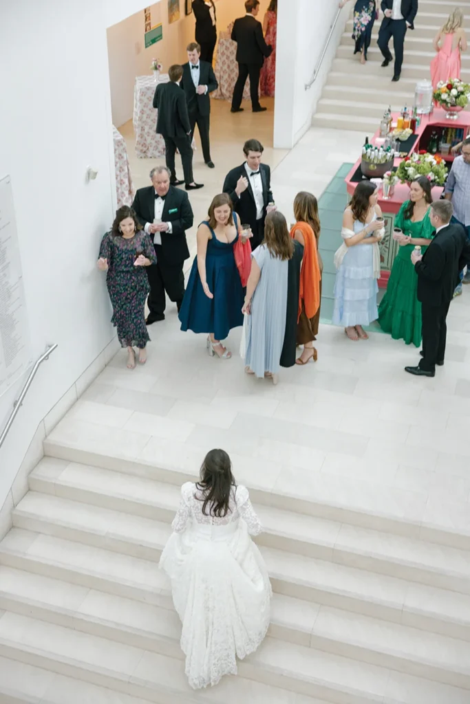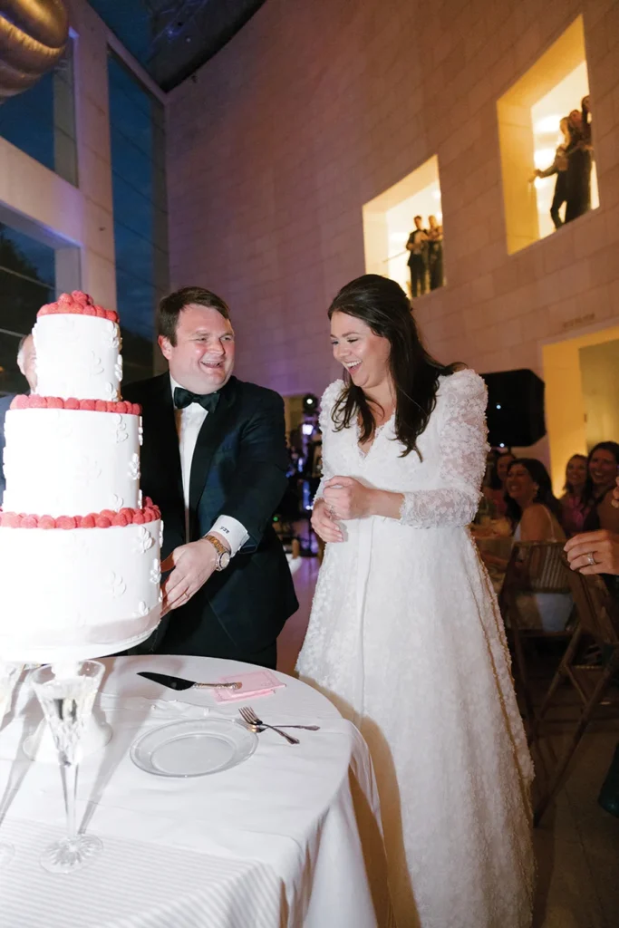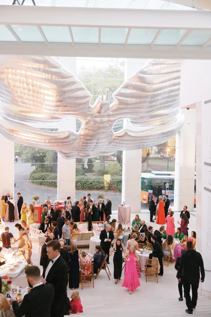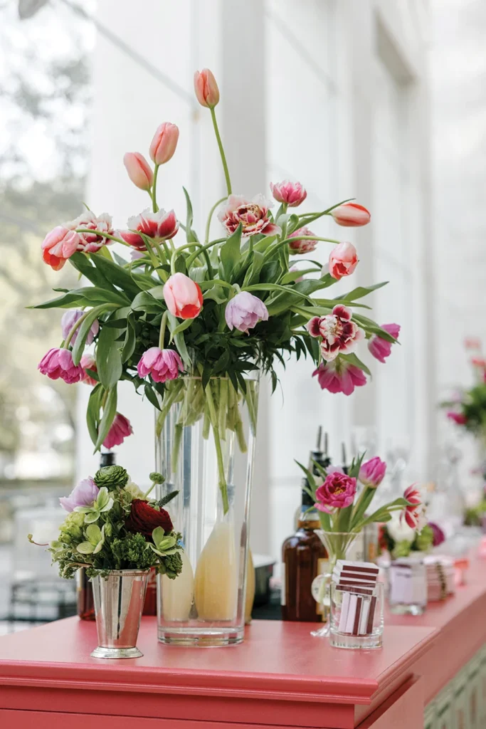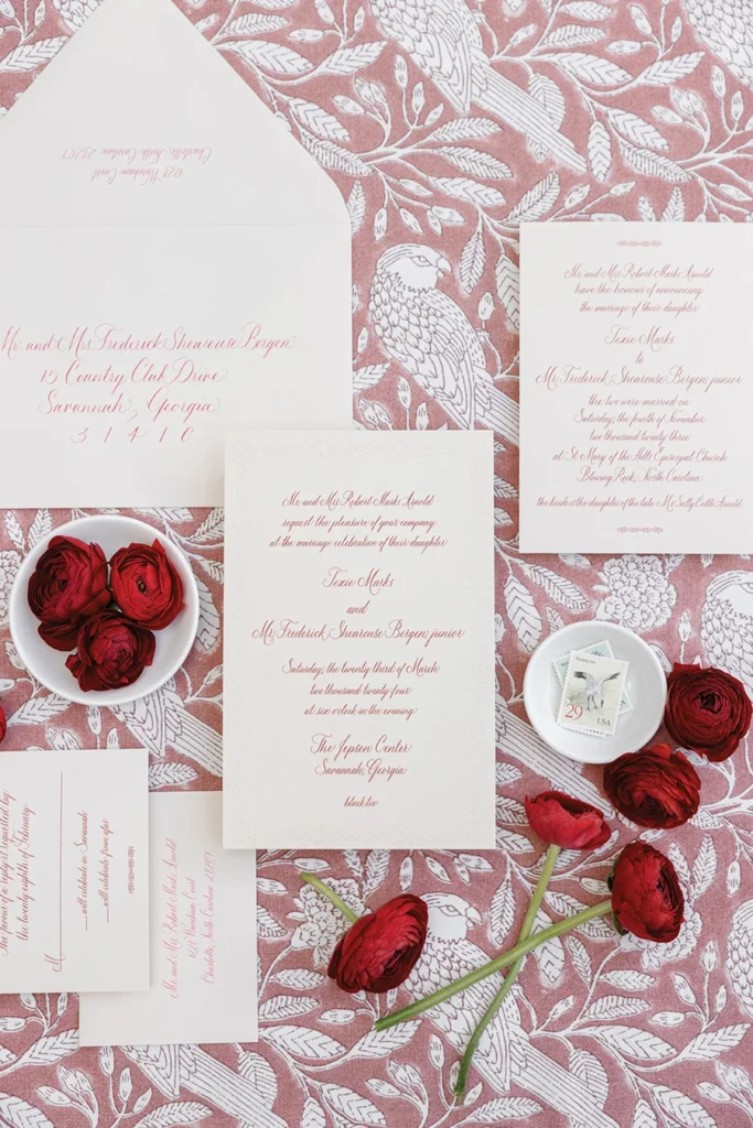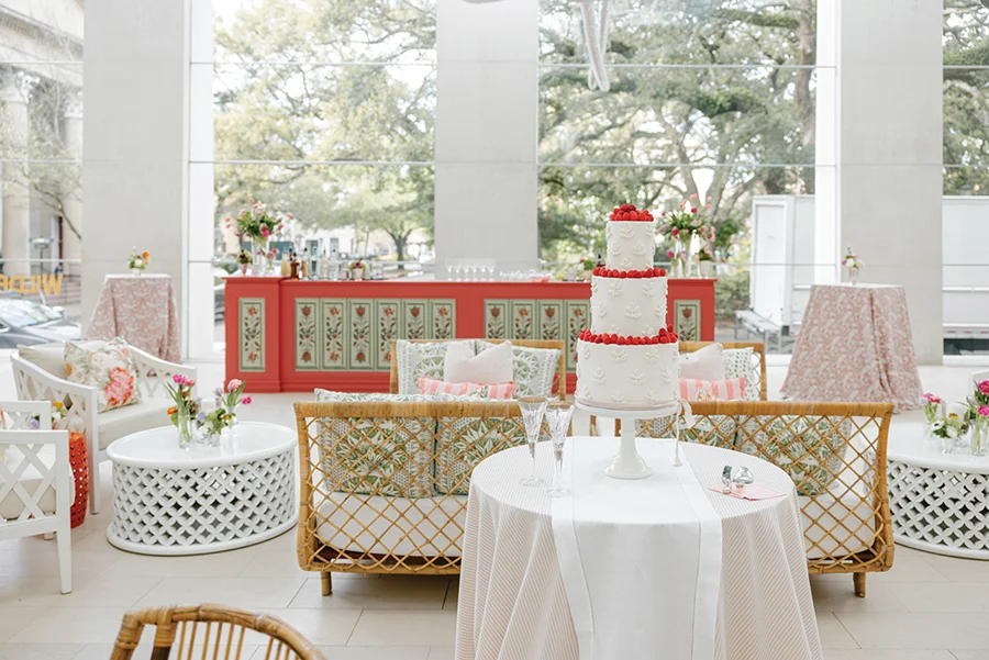 That ingenuity and wit was evident throughout their reception at the Jepson Center in downtown Savannah. After marrying several months earlier in a family ceremony in Blowing Rock — a special place for Texie’s Charlotte family — the couple knew the museum’s clean, sleek interior would provide a perfect canvas to showcase Texie’s vision. Custom bars featured batik-inspired trompe l’oeil wallpaper. Blending her love for Eastern batik patterns and her mother’s fondness for designer Ralph Lauren, Texie and planner Katrina Hutchins brought in accents of light blush and red. “My mom (who passed away before the wedding) was very much front of mind as I was planning this party,” Texie says. “She had impeccable taste, and I wanted her aesthetic to be represented.”